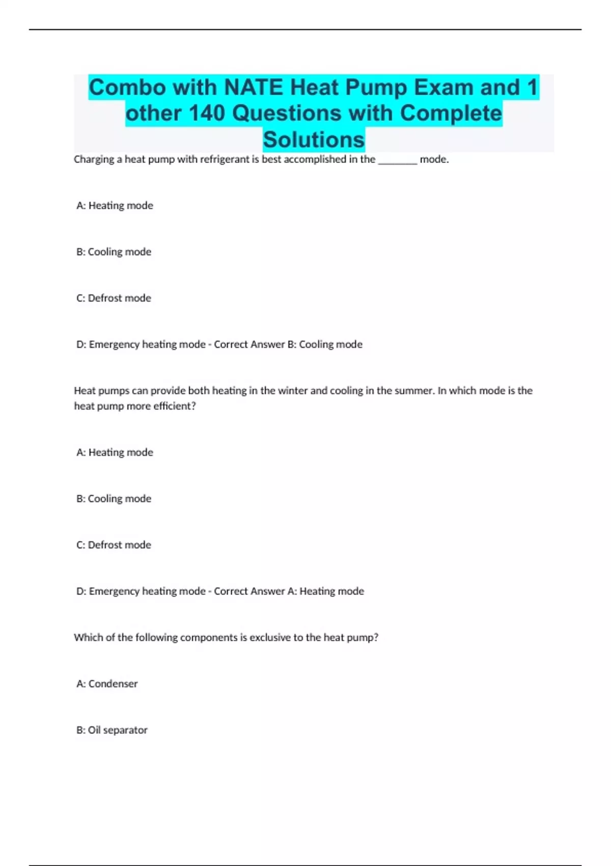 Combo with NATE Heat Pump Exam and 1 other 140 Questions with Complete Solutions Charging a heat pump with refrigerant is best accomplished in the _______ mode. A: Heating mode B: Cooling mode C: Defrost mode D: Emergency heating mode - Correct Answer B: Cooling mode Heat pumps can provide both heating in the winter and cooling in the summer. In which mode is the heat pump more efficient? A: Heating mode B: Cooling mode C: Defrost mode D: Emergency heating mode - Correct Answer A: Heating mode Which of the following components is exclusive to the heat pump? A: Condenser B: Oil separator