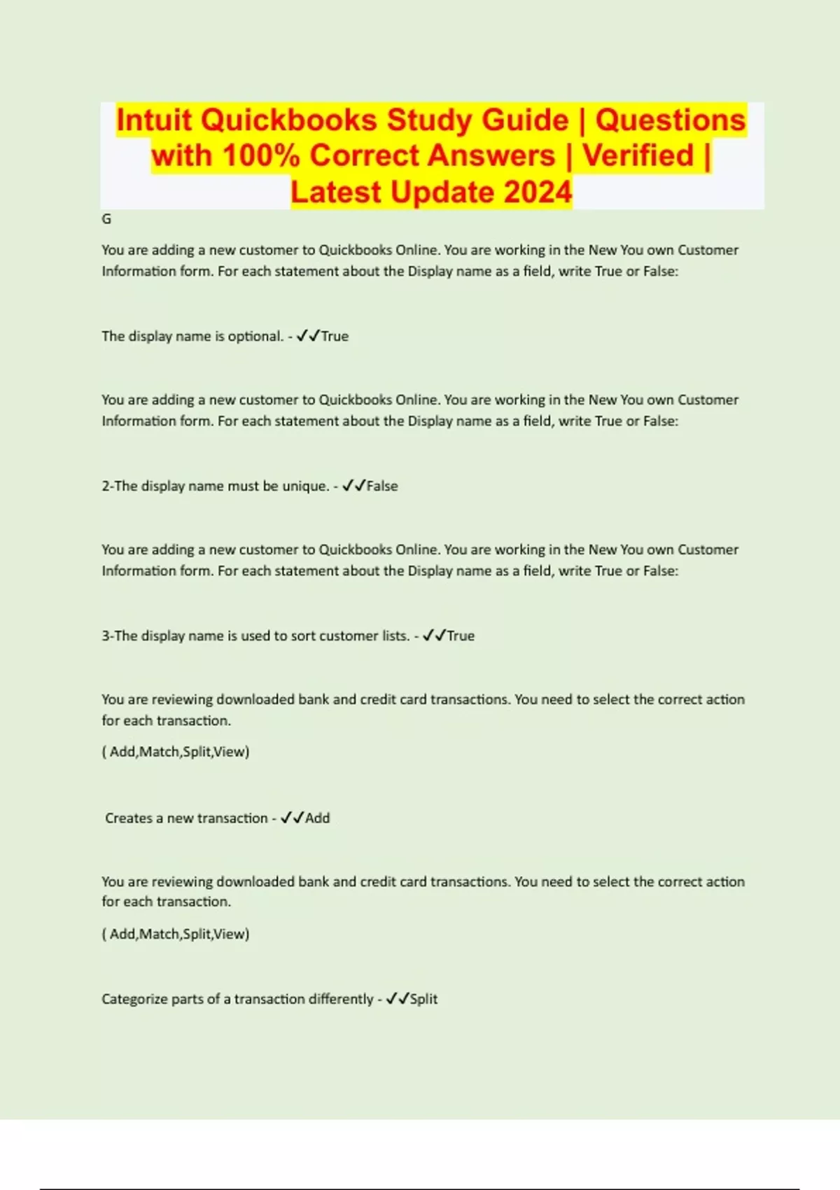 Intuit Quickbooks Study Guide | Questions with 100% Correct Answers | Verified | Latest Update 2024