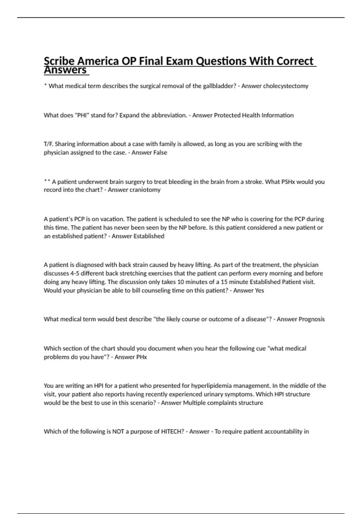 * What medical term describes the surgical removal of the gallbladder? - Answer cholecystectomy What does "PHI" stand for? Expand the abbreviation. - Answer Protected Health Information T/F. Sharing information about a case with family is allowed, as long as you are scribing with the physician assigned to the case. - Answer False ** A patient underwent brain surgery to treat bleeding in the brain from a stroke. What PSHx would you record into the chart? - Answer craniotomy A patient's PCP is on vacation. The patient is scheduled to see the NP who is covering for the PCP during this time. The patient has never been seen by the NP before. Is this patient considered a new patient or an established patient? - Answer Established A patient is diagnosed with back strain caused by heavy lifting. As part of the treatment, the physician discusses 4-5 different back stretching exercises that the patient can perform every morning and before doing any heavy lifting. The discussion only takes 10 minutes of a 15 minute Established Patient visit. Would your physician be able to bill counseling time on this patient? - Answer Yes What medical term would best describe "the likely course or outcome of a disease"? - Answer Prognosis Which section of the chart should you document when you hear the following cue "what medical problems do you have"? - Answer PHx You are writing an HPI for a patient who presented for hyperlipidemia management. In the middle of the visit, your patient also reports having recently experienced urinary symptoms. Which HPI structure would be the best to use in this scenario? - Answer Multiple complaints structure Which of the following is NOT a purpose of HITECH? - Answer - To require patient accountability in paying for their health care visit - To require government accountability on health insurance plans available in the market place -To require equal access, opportunity, and affordability for health insurance plans by screening patient health information What medical term would describe a patient with a history of infection or inflammation of the liver? - Answer Hepatitis For correct billing and reimbursement to go through, a counseling note requires documentation of the following: - Answer - Total time with the patient - Percentage of time spent counseling You are writing an HPI for a very complex patient who has had multiple recent hospital admissions for lung cancer. Which HPI structure would be the best to use in this scenario? - Answer Chronologic structure Which of the following would be valid complications for CAD? - Answer MI * 57 year old male patient presented with RLQ abdominal pain, which began 5 days ago. He states that he was mowing the lawn when the pain began. Patient reports he took OTC Tylenol yesterday without relief. There has been no nausea, vomiting or diarrhea. - Answer Yes, the HPI meets Level 4 billing criteria. What are the possible consequences of a HIPAA violation? (select all that apply) - Answer - Termination -Monetary fines to you and the hospital - Prison time -Lawsuit against you and the hospital -Violator is blacklisted from medical programs like Medical, PA, or NP school - Scribe program cancellation What does HIPAA stand for? Expand the abbreviation. Remember, do not include any spaces before or after the term/phrase. e.g. Correct way "Good luck" vs incorrect " good luck ". - Answer Health Insurance Portability and Accountability Act What chronic condition would require diagnosis through fasting blood glucose level or HbA1c? HINT: two words. Expand abbreviations. - Answer diabetes mellitus A patient states she has had a productive cough for 4 days, and yesterday she developed a fever. Would her fever be considered an associated symptom for her productive cough? Why or why not? - Answer Yes, because the fever started soon after the cough * Which of the following would be documented in the Objective section of the SOAP note? (select all that apply.) - Answer - Orders - Interpretations/results - Treatments (that may involve medication or procedures) - Physical exam HIPAA is a set of laws designed to _______. (Select the best option.) - Answer maintain patient privacy and confidentiality What condition correctly describes "blood clot in the lungs"? (Use the abbreviation form of the condition) - Answer PE * MACRA - Answer government healthcare initiative that focuses on quality of care to improve patient outcomes. * MIPS - Answer system of payment in which government funding is released if specific quality measures are tracked Quality Measures - Answer site specific health criteria that are tracked High Risk - Answer Moderate Risk - Answer Low Risk - Answer What chronic condition would require diagnosis through a lipid panel? Use the abbreviation form. - Answer HLD * Which of the following are considered non-reimbursable chief complaints? - Answer - Follow-up - Check-up - Medication refill - Lab results CP - Answer chest pain T/F. A family friend was recently evaluated for IDDM and lost his paperwork and does not know what medications he should be taking at home. He asks you to look up his medical record when you go to your shift today, giving you verbal permission to access his information. In this scenario, it is justifiable for you to use your EMR login to look up the important patient information. - Answer F