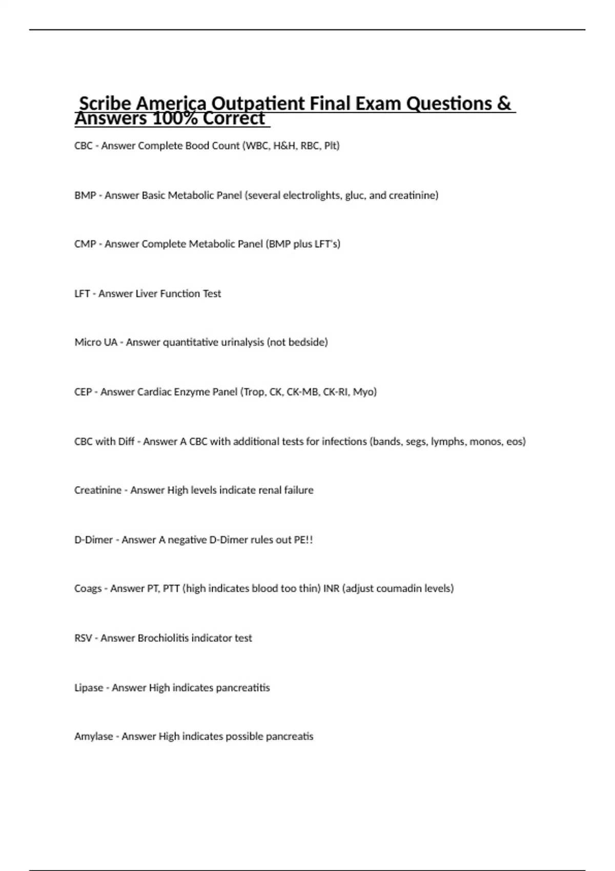 CBC - Answer Complete Bood Count (WBC, H&H, RBC, Plt) BMP - Answer Basic Metabolic Panel (several electrolights, gluc, and creatinine) CMP - Answer Complete Metabolic Panel (BMP plus LFT's) LFT - Answer Liver Function Test Micro UA - Answer quantitative urinalysis (not bedside) CEP - Answer Cardiac Enzyme Panel (Trop, CK, CK-MB, CK-RI, Myo) CBC with Diff - Answer A CBC with additional tests for infections (bands, segs, lymphs, monos, eos) Creatinine - Answer High levels indicate renal failure D-Dimer - Answer A negative D-Dimer rules out PE!! Coags - Answer PT, PTT (high indicates blood too thin) INR (adjust coumadin levels) RSV - Answer Brochiolitis indicator test Lipase - Answer High indicates pancreatitis Amylase - Answer High indicates possible pancreatis CRP (C-proteins) and ESR - Answer Inflammation labs HCG - Answer Urine or blood pregnancy test T+S ABORh - Answer Needs RhoGAM shot if pregnant Accu-Check - Answer Finger stick blood glucose Ketones - Answer Indicates Ketoacidosis BNP - Answer High indicates CHF Troponin - Answer High indicates MI Cardiac Order Set includes: - Answer CBC, BMP, CK and CK-MB, Trop, EKG and CXR Before documenting a procedure, must document.. - Answer Informed consent recieved Most common non-cardiac CP conditions - Answer Pericarditis (Inflammation of sac surrounding heart), Pleurisy (Inflammation of sac surrounding lungs), Costochondritis (irritation of ribs), Chest Wall Pain (irritation of chest wall, causes pain with palpation), and pleural effusion (collection of fluid around lungs) Most common pulmonary conditions - Answer Pneumonia (bacterial infection and fluid in lungs, diagnosed with productive cough), TB (serious infection of lungs), COPD (Chronic Bronchitis and Emphysema), Bronchitis (infection of the bronchi), Lung Cancer (uncontrolled cell growth in lungs) What are the most common EENT conditions? - Answer Otitis Media (middle ear infection), Cerumen Impaction (blocked by wax), Glaucoma (pressure behind the eye), Corneal Abrasion (scrape on the outer cornea), Conjunctivitis (pink eye), Epistaxis, Pharyngitis, Sinusitis