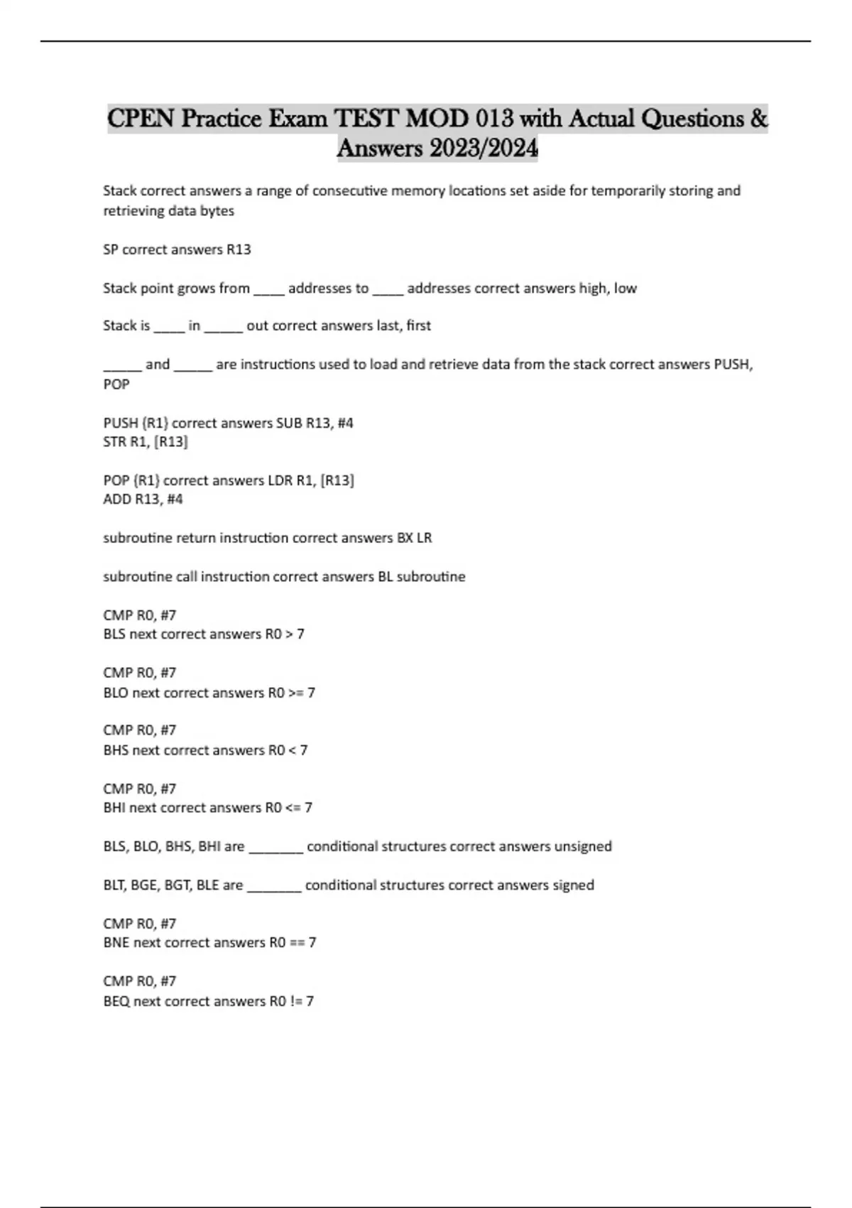 CPEN Practice Exam TEST MOD 013 with Actual Questions & Answers 2023/2024 Stack correct answers a range of consecutive memory locations set aside for temporarily storing and retrieving data bytes SP correct answers R13 Stack point grows from ____ addresses to ____ addresses correct answers high, low Stack is ____ in _____ out correct answers last, first _____ and _____ are instructions used to load and retrieve data from the stack correct answers PUSH, POP PUSH {R1} correct answers SUB R13, #4 STR R1, [R13] POP {R1} correct answers LDR R1, [R13] ADD R13, #4 subroutine return instruction correct answers BX LR subroutine call instruction correct answers BL subroutine CMP R0, #7 BLS next correct answers R0 > 7 CMP R0, #7 BLO next correct answers R0 >= 7 CMP R0, #7 BHS next correct answers R0 < 7