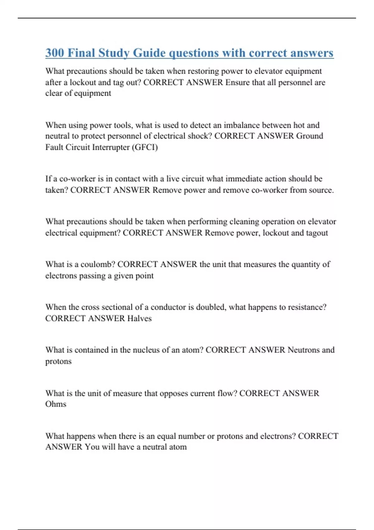 What precautions should be taken when restoring power to elevator equipment after a lockout and tag out? CORRECT ANSWER Ensure that all personnel are clear of equipment When using power tools, what is used to detect an imbalance between hot and neutral to protect personnel of electrical shock? CORRECT ANSWER Ground Fault Circuit Interrupter (GFCI) If a co-worker is in contact with a live circuit what immediate action should be taken? CORRECT ANSWER Remove power and remove co-worker from source. What precautions should be taken when performing cleaning operation on elevator electrical equipment? CORRECT ANSWER Remove power, lockout and tagout What is a coulomb? CORRECT ANSWER the unit that measures the quantity of electrons passing a given point When the cross sectional of a conductor is doubled, what happens to resistance? CORRECT ANSWER Halves What is contained in the nucleus of an atom? CORRECT ANSWER Neutrons and protons