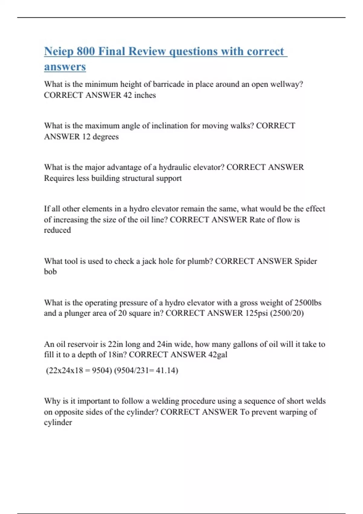 What is the minimum height of barricade in place around an open wellway? CORRECT ANSWER 42 inches What is the maximum angle of inclination for moving walks? CORRECT ANSWER 12 degrees What is the major advantage of a hydraulic elevator? CORRECT ANSWER Requires less building structural support If all other elements in a hydro elevator remain the same, what would be the effect of increasing the size of the oil line? CORRECT ANSWER Rate of flow is reduced What tool is used to check a jack hole for plumb? CORRECT ANSWER Spider bob What is the operating pressure of a hydro elevator with a gross weight of 2500lbs and a plunger area of 20 square in? CORRECT ANSWER 125psi (2500/20) An oil reservoir is 22in long and 24in wide, how many gallons of oil will it take to fill it to a depth of 18in? CORRECT ANSWER 42gal (22x24x18 = 9504) (9504/231= 41.14) Why is it important to follow a welding procedure using a sequence of short welds on opposite sides of the cylinder? CORRECT ANSWER To prevent warping of cylinder