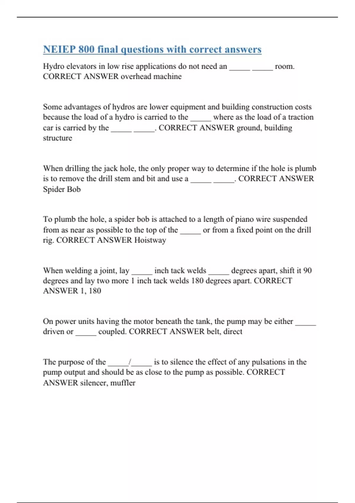 Hydro elevators in low rise applications do not need an _____ _____ room. CORRECT ANSWER overhead machine Some advantages of hydros are lower equipment and building construction costs because the load of a hydro is carried to the _____ where as the load of a traction car is carried by the _____ _____. CORRECT ANSWER ground, building structure When drilling the jack hole, the only proper way to determine if the hole is plumb is to remove the drill stem and bit and use a _____ _____. CORRECT ANSWER Spider Bob To plumb the hole, a spider bob is attached to a length of piano wire suspended from as near as possible to the top of the _____ or from a fixed point on the drill rig. CORRECT ANSWER Hoistway When welding a joint, lay _____ inch tack welds _____ degrees apart, shift it 90 degrees and lay two more 1 inch tack welds 180 degrees apart. CORRECT ANSWER 1, 180 On power units having the motor beneath the tank, the pump may be either _____ driven or _____ coupled. CORRECT ANSWER belt, direct The purpose of the _____/_____ is to silence the effect of any pulsations in the pump output and should be as close to the pump as possible. CORRECT ANSWER silencer, muffler