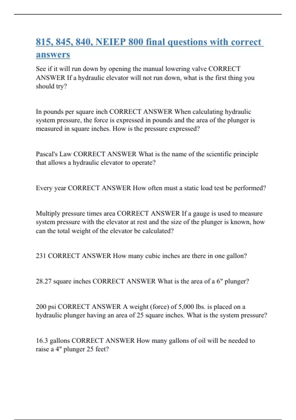 See if it will run down by opening the manual lowering valve CORRECT ANSWER If a hydraulic elevator will not run down, what is the first thing you should try? In pounds per square inch CORRECT ANSWER When calculating hydraulic system pressure, the force is expressed in pounds and the area of the plunger is measured in square inches. How is the pressure expressed? Pascal's Law CORRECT ANSWER What is the name of the scientific principle that allows a hydraulic elevator to operate? Every year CORRECT ANSWER How often must a static load test be performed? Multiply pressure times area CORRECT ANSWER If a gauge is used to measure system pressure with the elevator at rest and the size of the plunger is known, how can the total weight of the elevator be calculated? 231 CORRECT ANSWER How many cubic inches are there in one gallon? 28.27 square inches CORRECT ANSWER What is the area of a 6" plunger? 200 psi CORRECT ANSWER A weight (force) of 5,000 lbs. is placed on a hydraulic plunger having an area of 25 square inches. What is the system pressure? 16.3 gallons CORRECT ANSWER How many gallons of oil will be needed to raise a 4" plunger 25 feet?