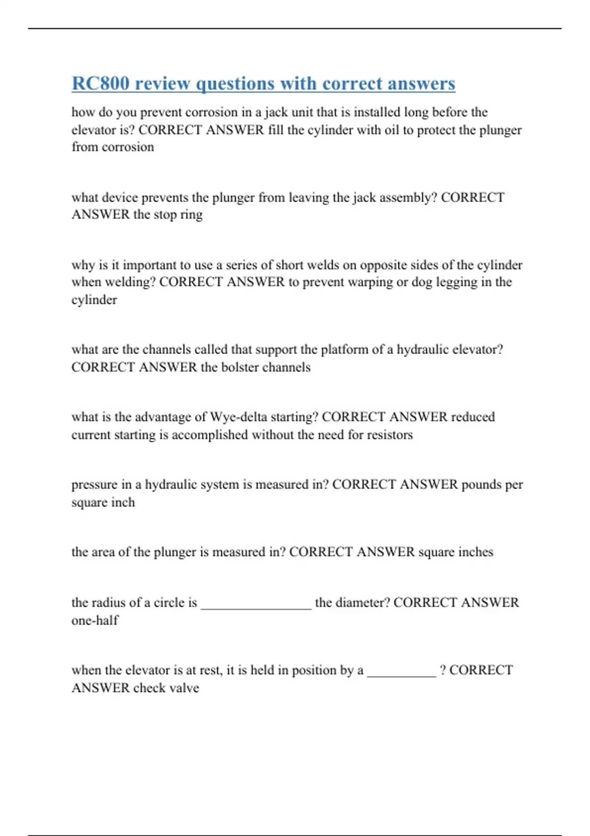 how do you prevent corrosion in a jack unit that is installed long before the elevator is? CORRECT ANSWER fill the cylinder with oil to protect the plunger from corrosion what device prevents the plunger from leaving the jack assembly? CORRECT ANSWER the stop ring why is it important to use a series of short welds on opposite sides of the cylinder when welding? CORRECT ANSWER to prevent warping or dog legging in the cylinder what are the channels called that support the platform of a hydraulic elevator? CORRECT ANSWER the bolster channels what is the advantage of Wye-delta starting? CORRECT ANSWER reduced current starting is accomplished without the need for resistors pressure in a hydraulic system is measured in? CORRECT ANSWER pounds per square inch the area of the plunger is measured in? CORRECT ANSWER square inches the radius of a circle is ________________ the diameter? CORRECT ANSWER one-half when the elevator is at rest, it is held in position by a __________ ? CORRECT ANSWER check valve