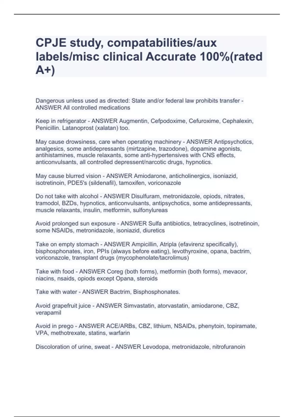 CPJE study, compatabilities/aux labels/misc clinical Accurate 100%(rated A+) Dangerous unless used as directed: State and/or federal law prohibits transfer - ANSWER All controlled medications Keep in refrigerator - ANSWER Augmentin, Cefpodoxime, Cefuroxime, Cephalexin, Penicillin. Latanoprost (xalatan) too. May cause drowsiness, care when operating machinery - ANSWER Antipsychotics, analgesics, some antidepressants (mirtzapine, trazodone), dopamine agonists, antihistamines, muscle relaxants, some anti-hypertensives with CNS effects, anticonvulsants, all controlled depressent/narcotic drugs, hypnotics. May cause blurred vision - ANSWER Amiodarone, anticholinergics, isoniazid, isotretinoin, PDE5's (sildenafil), tamoxifen, voriconazole Do not take with alcohol - ANSWER Disulfuram, metronidazole, opiods, nitrates, tramodol, BZDs, hypnotics, anticonvulsants, antipsychotics, some antidepressants, muscle relaxants, insulin, metformin, sulfonylureas Avoid prolonged sun exposure - ANSWER Sulfa antibiotics, tetracyclines, isotretinoin, some NSAIDs, metronidazole, isoniazid, diuretics Take on empty stomach - ANSWER Ampicillin, Atripla (efavirenz specifically), bisphosphonates, iron, PPIs (always before eating), levothyroxine, opana, bactrim, voriconazole, transplant drugs (mycophenolate/tacrolimus) Take with food - ANSWER Coreg (both forms), metformin (both forms), mevacor, niacins, nsaids, opiods except Opana, steroids Take with water - ANSWER Bactrim, Bisphosphonates. Avoid grapefruit juice - ANSWER Simvastatin, atorvastatin, amiodarone, CBZ, Dangerous