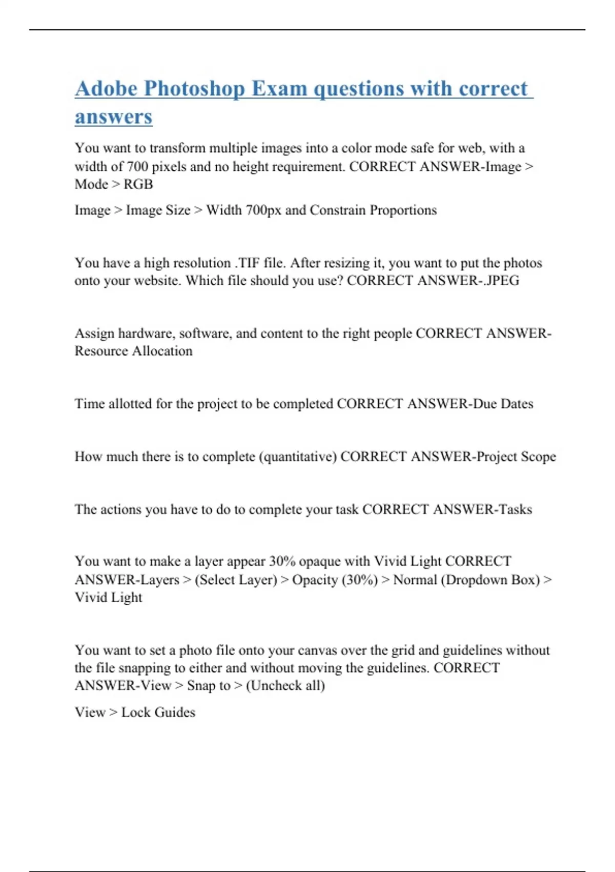 You want to transform multiple images into a color mode safe for web, with a width of 700 pixels and no height requirement. CORRECT ANSWER-Image > Mode > RGB Image > Image Size > Width 700px and Constrain Proportions You have a high resolution .TIF file. After resizing it, you want to put the photos onto your website. Which file should you use? CORRECT ANSWER-.JPEG Assign hardware, software, and content to the right people CORRECT ANSWER-Resource Allocation Time allotted for the project to be completed CORRECT ANSWER-Due Dates How much there is to complete (quantitative) CORRECT ANSWER-Project Scope The actions you have to do to complete your task CORRECT ANSWER-Tasks You want to make a layer appear 30% opaque with Vivid Light CORRECT ANSWER-Layers > (Select Layer) > Opacity (30%) > Normal (Dropdown Box) > Vivid Light