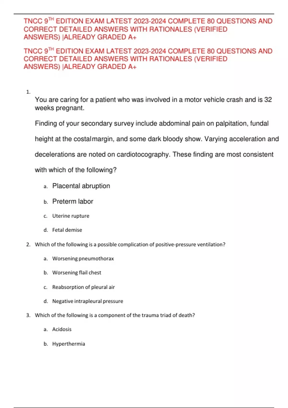 , TNCC 9TH EDITION EXAM LATEST 2023-2024 COMPLETE 80 QUESTIONS AND