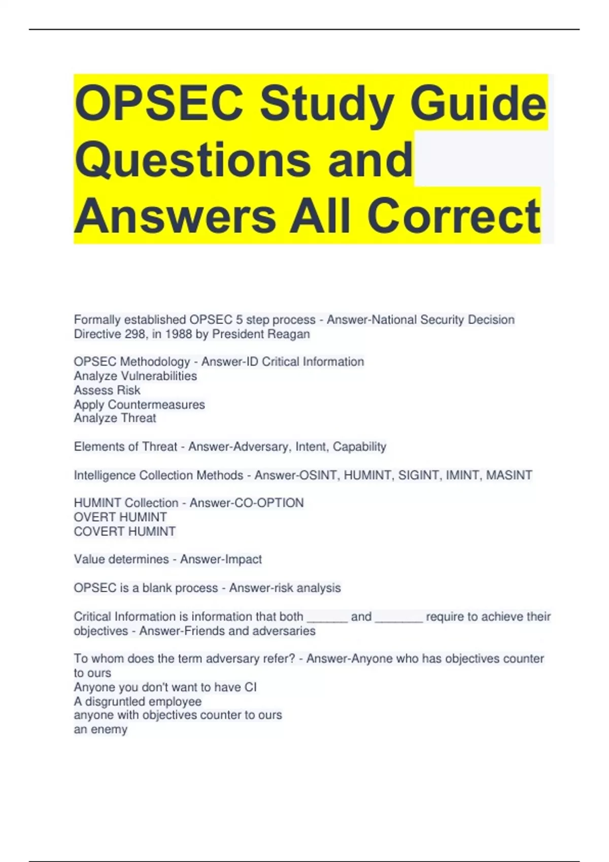 OPSEC Study Guide Questions and Answers All Correct Formally established OPSEC 5 step process - Answer-National Security Decision Directive 298, in 1988 by President Reagan OPSEC Methodology - Answer-ID Critical Information Analyze Vulnerabilities Assess Risk Apply Countermeasures Analyze Threat Elements of Threat - Answer-Adversary, Intent, Capability Intelligence Collection Methods - Answer-OSINT, HUMINT, SIGINT, IMINT, MASINT HUMINT Collection - Answer-CO-OPTION OVERT HUMINT COVERT HUMINT Value determines - Answer-Impact OPSEC is a blank process - Answer-risk analysis Critical Information is information that both ______ and _______ require to achieve their objectives - Answer-Friends and adversaries To whom does the term adversary refer? - Answer-Anyone who has objectives counter to ours Anyone you don't want to have CI A disgruntled employee anyone with objectives counter to ours an enemy When you assess the threat, who besides the adversary should you consider? - Answer-Friends of the adversary Anyone who might share intel with the adversary In order to be a threat, an adversary must have both ________ and __________ - Answer-Adversary with Intent and capability to harm us, our operation, or our resources