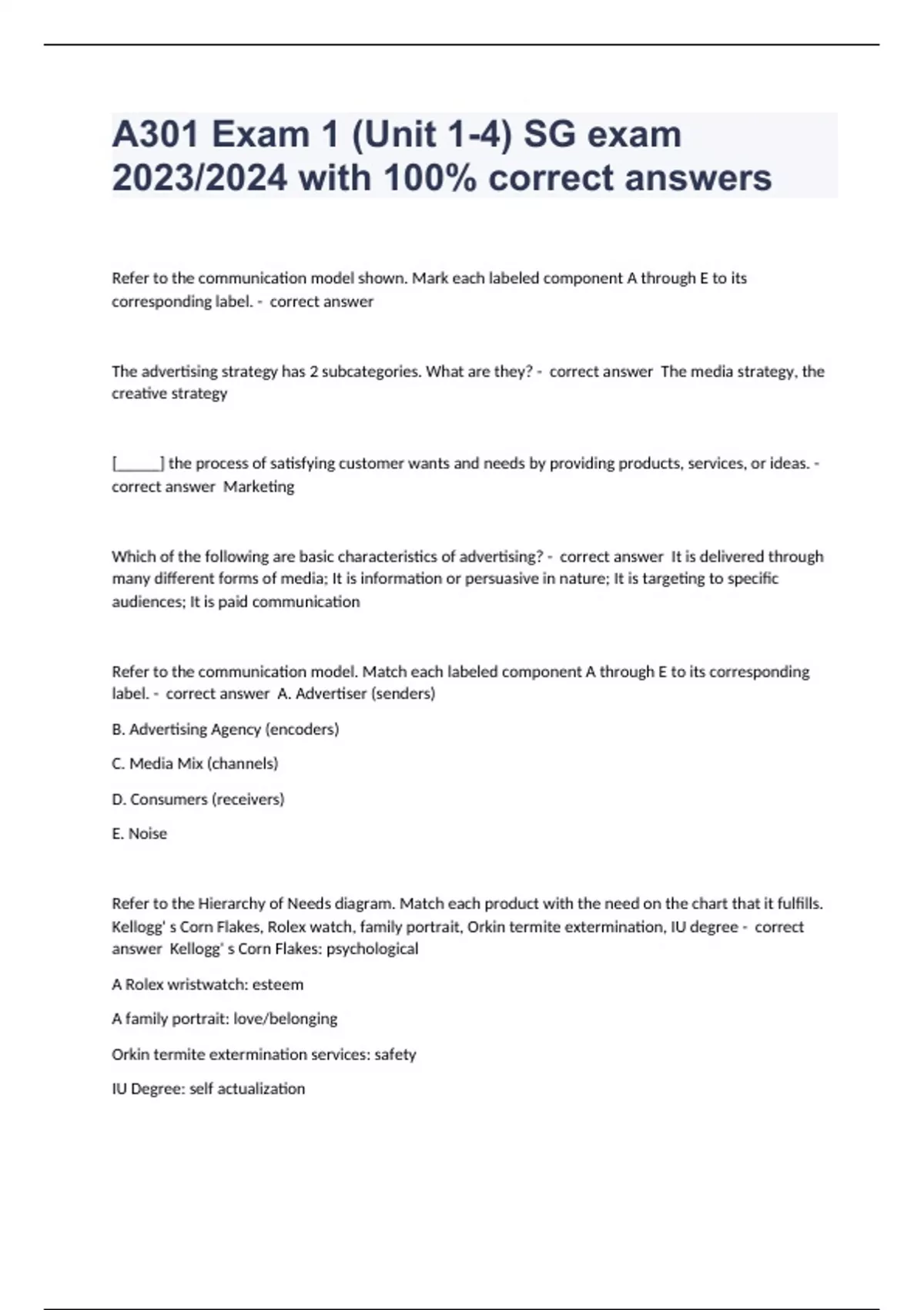 Refer to the communication model shown. Mark each labeled component A through E to its corresponding label. - correct answer The advertising strategy has 2 subcategories. What are they? - correct answer The media strategy, the creative strategy [_____] the process of satisfying customer wants and needs by providing products, services, or ideas. - correct answer Marketing Which of the following are basic characteristics of advertising? - correct answer It is delivered through many different forms of media; It is information or persuasive in nature; It is targeting to specific audiences; It is paid communication Refer to the communication model. Match each labeled component A through E to its corresponding label. - correct answer A. Advertiser (senders) B. Advertising Agency (encoders) C. Media Mix (channels) D. Consumers (receivers) E. Noise Refer to the Hierarchy of Needs diagram. Match each product with the need on the chart that it fulfills. Kellogg' s Corn Flakes, Rolex watch, family portrait, Orkin termite extermination, IU degree - correct answer Kellogg' s Corn Flakes: psychological A Rolex wristwatch: esteem A family portrait: love/belonging Orki