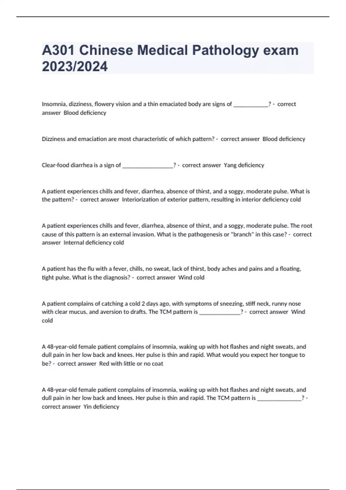 Insomnia, dizziness, flowery vision and a thin emaciated body are signs of ___________? - correct answer Blood deficiency Dizziness and emaciation are most characteristic of which pattern? - correct answer Blood deficiency Clear-food diarrhea is a sign of ________________? - correct answer Yang deficiency A patient experiences chills and fever, diarrhea, absence of thirst, and a soggy, moderate pulse. What is the pattern? - correct answer Interiorization of exterior pattern, resulting in interior deficiency cold A patient experiences chills and fever, diarrhea, absence of thirst, and a soggy, moderate pulse. The root cause of this pattern is an external invasion. What is the pathogenesis or "branch" in this case? - correct answer Internal deficiency cold A patient has the flu with a fever, chills, no sweat, lack of thirst, body aches and pains and a floating, tight pulse. What is the diagnosis? - correct answer Wind cold A patient complains of catching a cold 2 days ago, with symptoms of sneezing, stiff neck, runny nose with clear mucus, and aversion to drafts. The TCM pattern is _____________? - correct answer Wind cold A 48-year-old female patient complains of insomnia, waking up with hot flashes and night sweats, and dull pain in her low back and knees. Her pulse is thin and rapid. What would you expect her tongue to be? - correct answer Red with little or no coat A 48-year-old female patient complains of insomnia, waking up with hot flashes and night sweats, and dull pain in her low back and knees. Her pulse is thin and rapid. The TCM pattern is ______________? - correct answer Yin deficiency