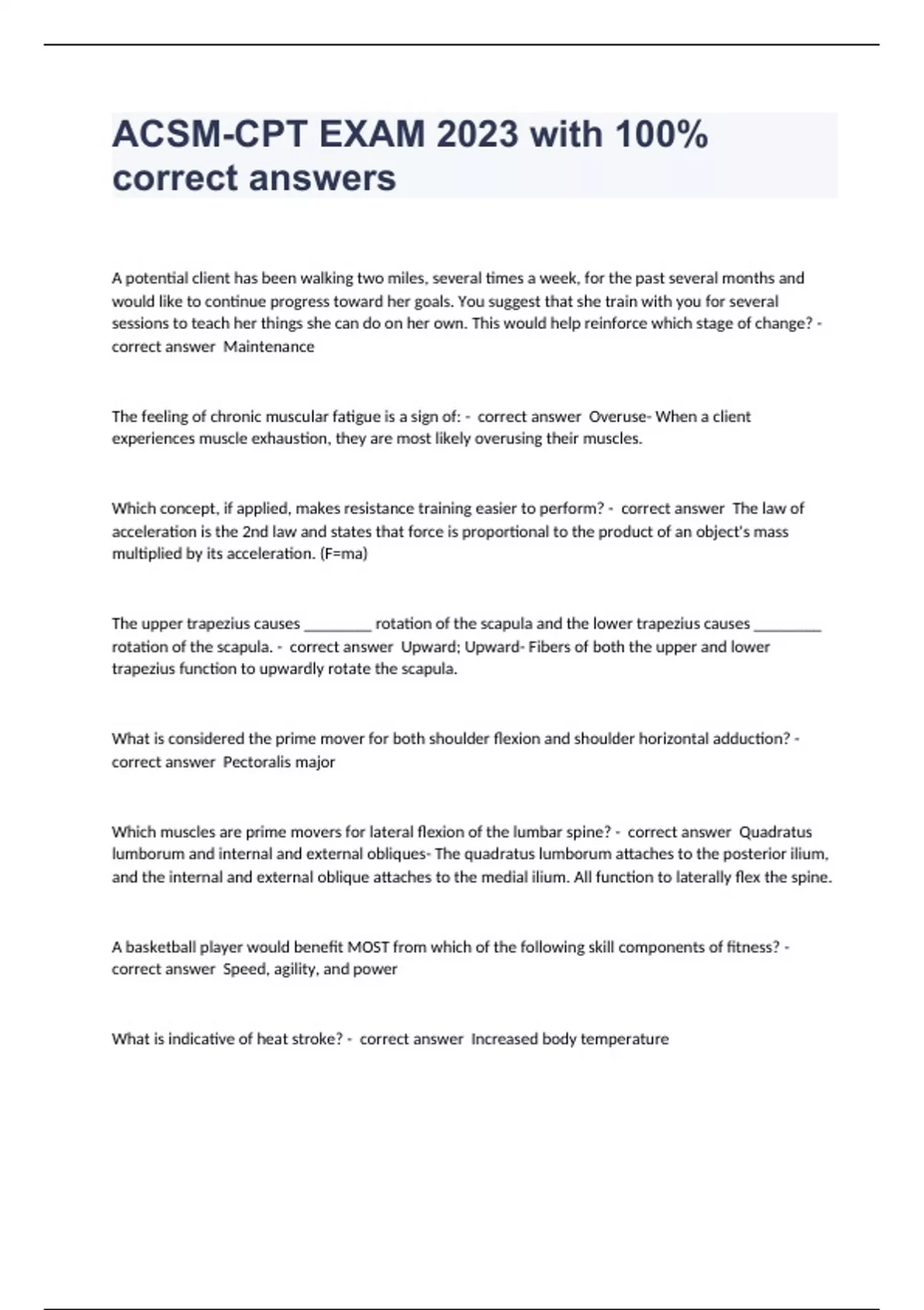 A potential client has been walking two miles, several times a week, for the past several months and would like to continue progress toward her goals. You suggest that she train with you for several sessions to teach her things she can do on her own. This would help reinforce which stage of change? - correct answer Maintenance The feeling of chronic muscular fatigue is a sign of: - correct answer Overuse- When a client experiences muscle exhaustion, they are most likely overusing their muscles. Which concept, if applied, makes resistance training easier to perform? - correct answer The law of acceleration is the 2nd law and states that force is proportional to the product of an object's mass multiplied by its acceleration. (F=ma) The upper trapezius causes ________ rotation of the scapula and the lower trapezius causes ________ rotation of the scapula. - correct answer Upward; Upward- Fibers of both the upper and lower trapezius function to upwardly rotate the scapula. What is considered the prime mover for both shoulder flexion and shoulder horizontal adduction? - correct answer Pectoralis major Which muscles are prime movers for lateral flexion of the lumbar spine? - correct answer Quadratus lumborum and internal and external obliques- The quadratus lumborum attaches to the posterior ilium, and the internal and external oblique attaches to the medial ilium. All function to laterally flex the spine. A basketball player would benefit MOST from which of the following skill components of fitness? - correct answer Speed, agility, and power What is indicative of heat stroke? - correct answer Increased body temperature Individ