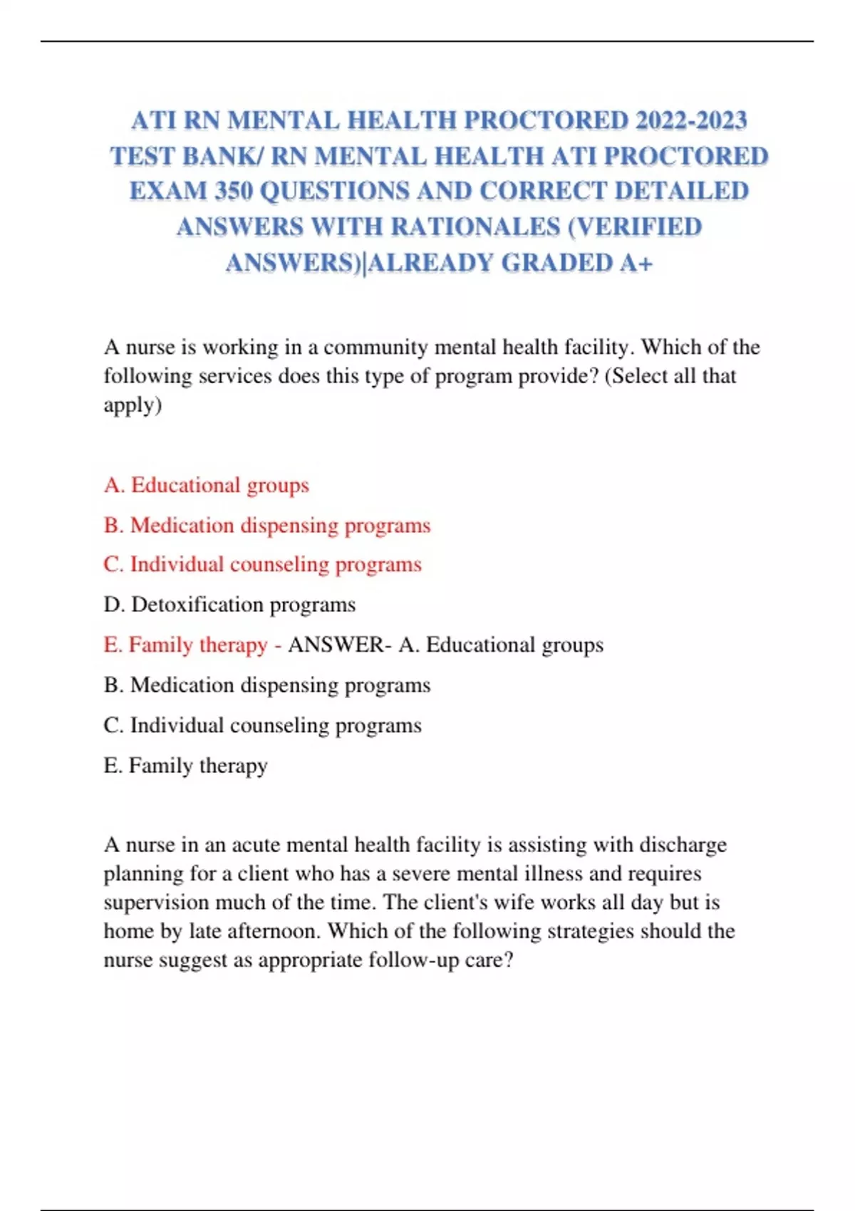 ATI RN MENTAL HEALTH PROCTORED TEST BANK/ RN MENTAL HEALTH ATI PROCTORED EXAM 350 QUESTIONS AND CORRECT DETAILED ANSWERS WITH RATIONALES (VERIFIED ANSWERS)|ALREADY GRADED A+