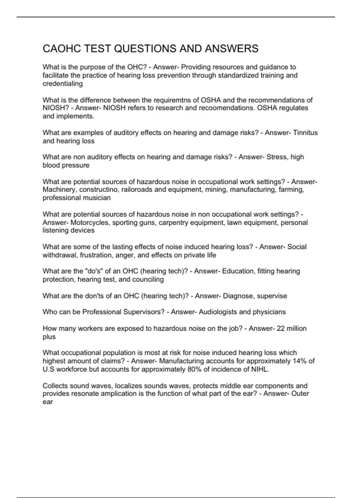 What is the purpose of the OHC? - Answer- Providing resources and guidance to facilitate the practice of hearing loss prevention through standardized training and credentialing What is the difference between the requiremtns of OSHA and the recommendations of NIOSH? - Answer- NIOSH refers to research and recoomendations. OSHA regulates and implements. What are examples of auditory effects on hearing and damage risks? - Answer- Tinnitus and hearing loss What are non auditory effects on hearing and damage risks? - Answer- Stress, high blood pressure What are potential sources of hazardous noise in occupational work settings? - Answer- Machinery, constructino, railoroads and equipment, mining, manufacturing, farming, professional musician What are potential sources of hazardous noise in non occupational work settings? - Answer- Motorcycles, sporting guns, carpentry equipment, lawn equipment, personal listening devices What are some of the lasting effects of noise induced hearing loss? - Answer- Social withdrawal, frustration, anger, and effects on private life What are the "do's" of an OHC (hearing tech)? - Answer- Education, fitting hearing protection, hearing test, and counciling What are the don'ts of an OHC (hearing tech)? - Answer- Diagnose, supervise Who can be Professional Supervisors? - Answer- Audiologists and physicians How many workers are exposed to hazardous noise on the job? - Answer- 22 million plus What occupational population is most at risk for noise induced hearing loss which highest amount of claims? - Answer- Manufacturing accounts for approximately 14% of U.S workforce but accounts for approximately 80% of incidence of NIHL. Collects sound waves, localizes sounds waves, protects middle ear components and provides resonate amplication is the function of what part of the ear? - Answer- Outer ear Acoustic transformer, impedance matching system, provides pressue equalization, and protects the inner ear is the function of what part of the ear? - Answer- Middle ear Provides intensity, frequency and temporal coding that is relayed via the auditory nerve for further processing is the function of what part of the ear? - Answer- Inner ear An early stage indication of noise induced hearing loss is identified typically at which frequencies on an audiogram? - Answer- 3-6 kHz What is a general rule of conductive hearing loss? - Answer- Flat and often worse at low frequencies What would be an indication of an advanced stage noise induced hearing loss? -