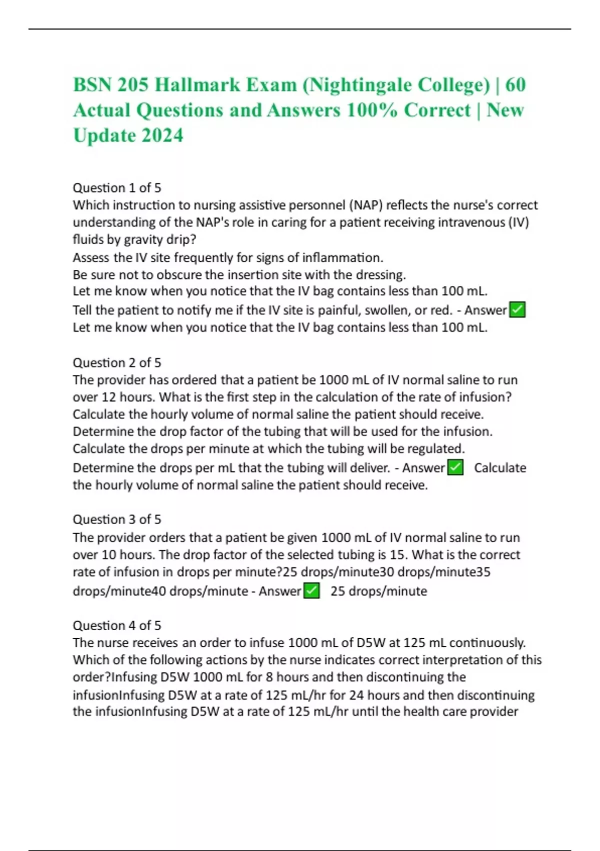 BSN 205 Hallmark Exam (Nightingale College) | 60 Actual Questions and Answers 100% Correct | New Update 2024