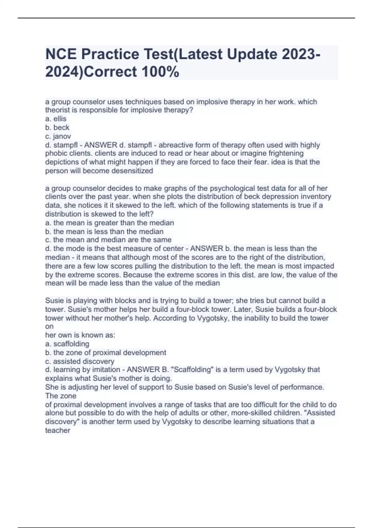 a group counselor uses techniques based on implosive therapy in her work. which theorist is responsible for implosive therapy? a. ellis b. beck c. janov d. stampfl - ANSWER d. stampfl - abreactive form of therapy often used with highly phobic clients. clients are induced to read or hear about or imagine frightening depictions of what might happen if they are forced to face their fear. idea is that the person will become desensitized a group counselor decides to make graphs of the psychological test data for all of her clients over the past year. when she plots the distribution of beck depression inventory data, she notices it it skewed to the left. which of the following statements is true if a distribution is skewed to the left? a. the mean is greater than the median b. the mean is less than the median c. the mean and median are the same d. the mode is the best measure of center - ANSWER b. the mean is less than the median - it means that although most of the scores are to the right of the distribution, there are a few low scores pulling the distribution to the left. the mean is most impacted by the extreme scores. Because the extreme scores in this dist. are low, the value of the mean will be made less than the value of the median Susie is playing with blocks and is trying to build a tower; she tries but cannot build a tower. Susie's mother helps her build a four-block tower. Later, Susie builds a four-block tower without her mother's help. According to Vygotsky, the inability to build the tower on her own is known as: a. scaffolding b. the zone of proximal development c. assisted discovery d. learning by imitation - ANSWER B. "Scaffolding" is a term used by Vygotsky that explains what Susie's mother is doing. She is adjusting her level of support to Susie based on Susie's level of performance. The zone of proximal development involves a range of tasks that are too difficult for the child to do alone but possible to do with the help of adults or other, more-skilled children. "Assisted discovery" is another term used by Vygotsky to describe learning situations that a teacher sets up within a classroom so that children are guided into discovering learning. Learning by imitation is a type of learning that involves a child watching someone perform a task and later performing the task by herself. According to Erickson, when an individual fails to develop a strong sense of identity, the individual will have troubles with the development of: a. autonomy b. initiative c. intimacy d. integrity - ANSWER C. In Erickson's theory of psychosocial development, individuals who fail to achieve the goal of the lower level of development will have problems attaining the developmental task at the next stage of development. In the example above, the individual failed to achieve identity, which occurs during adolescence. Therefore, in young adulthood, the individual will have problems attaining intimacy, which is the developmental task to be achieved at this level. For autonomy, the individual would have to have failed to attain basic trust; for initiative, the individual would have to have failed to attain autonomy; and for integrity, the individual would have to have failed to attain generativity. Which of the following is the correct sequence of stages in Freud's theory of personality development? a. Oral, genital, latency, anal, phallic b. Genital, anal, phallic, oral, latency c. Latency, phallic, oral, anal, genital d. Oral, anal, phallic, latency, genital - ANSWER D. The best way to remember Freud's psychosexual stages of development is to think about what key tasks individuals do throughout childhood. The first thing infants do is suck (oral). Next, babies begin toilet training (anal), then discover the difference between boys and girls (phallic). Next, children spend time growing physic