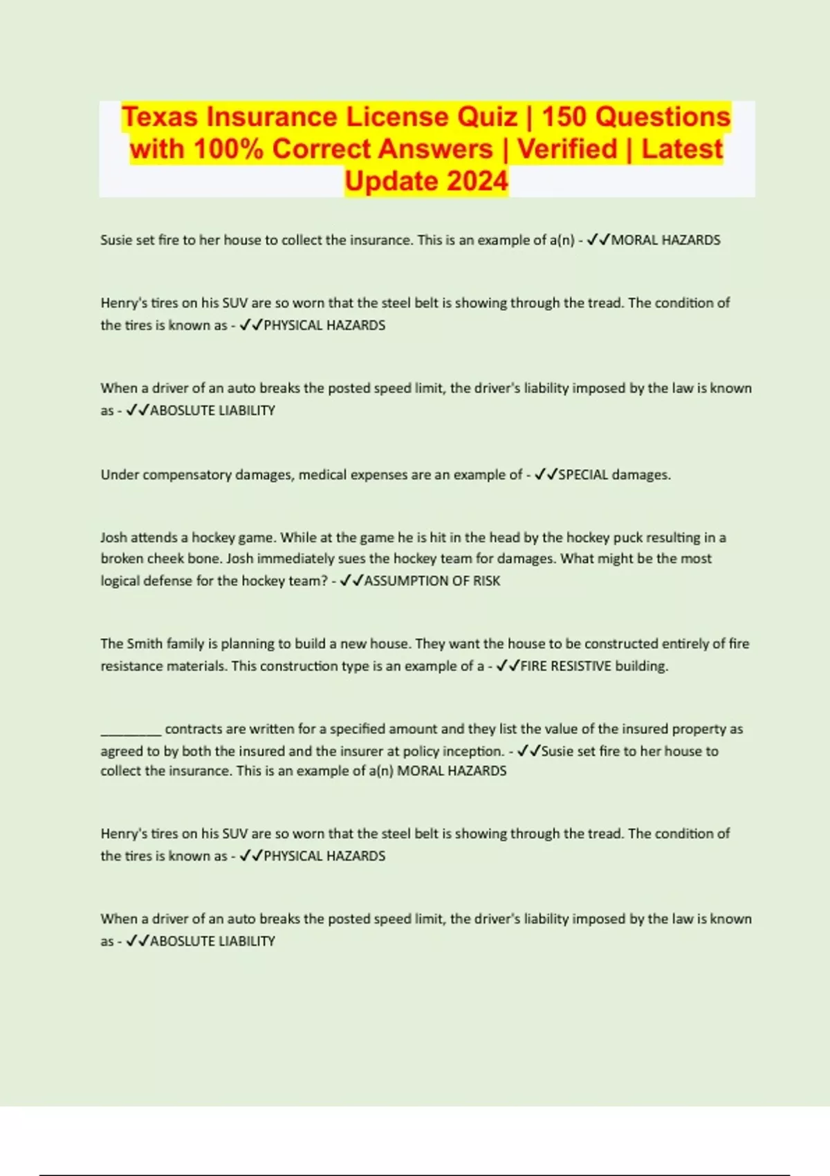 Texas Insurance License Quiz | 150 Questions with 100% Correct Answers | Verified | Latest Update 2024