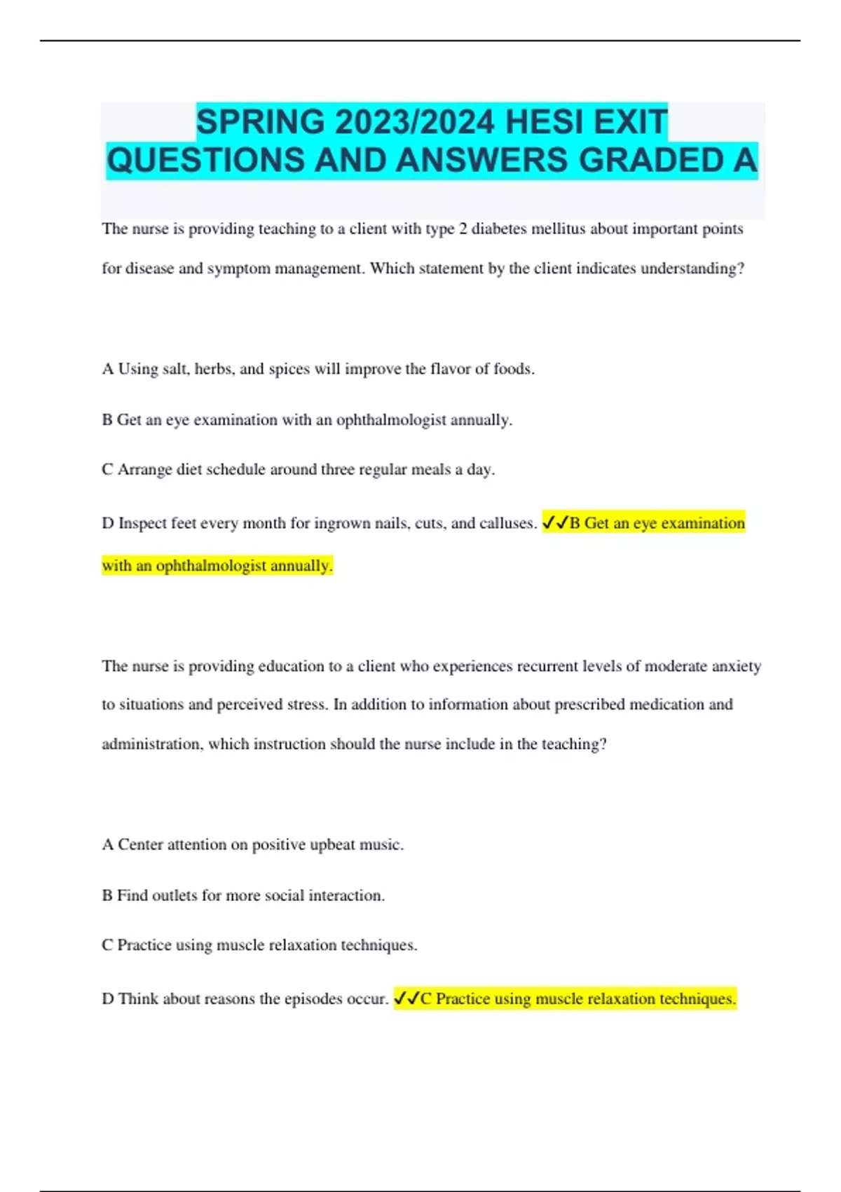 SPRING 2023/2024 HESI EXIT QUESTIONS AND ANSWERS GRADED A The nurse is providing teaching to a client with type 2 diabetes mellitus about important points for disease and symptom management. Which statement by the client indicates understanding? A Using salt, herbs, and spices will improve the flavor of foods. B Get an eye examination with an ophthalmologist annually. C Arrange diet schedule around three regular meals a day. D Inspect feet every month for ingrown nails, cuts, and calluses. B Get an eye examination with an ophthalmologist annually. The nurse is providing education to a client who experiences recurrent levels of moderate anxiety to situations and perceived stress. In addition to information about prescribed medication and administration, which instruction should the nurse include in the teaching? A Center attention on positive upbeat music. B Find outlets for more social interaction. C Practice using muscle relaxation techniques. D Think about reasons the episodes occur. C Practice using muscle relaxation techniques. The charge nurse is planning for the shift and has a registered nurse (RN) and a practical nurse (PN) on the team. Which client should the charge nurse assign to the RN? A A 75-year-old client with renal calculi who requires urine straining. B A 64-year-old client who had a total hip replacement the previous day. C A 30-year-old depressed client who admits to suicide ideation. D An adolescent with multiple contusions due to a fall that occurred 2 days ago. C A 30-year-old depressed client who admits to suicide ideation. A client with pancreatitis complains of severe epigastric pain, so the nurse administers a prescribed narcotic analgesic. Ten minutes later, the client insists on sitting up and leaning forward. Which intervention should the nurse implement? A Raise head of bed until to a 90 degree angle. B Position bedside table so the client can lean across it. C Place bed in a reverse trendelenburg position. D Encourage rest until the analgesic becomes effective. B Position bedside table so the client can lean across it. The nurse is caring for a client who arrives to the emergency department with reports of experiencing dizziness and difficulty walking to the bathroom. The nurse observes right-sided weakness and sluggish enunciation of speech. The nurse should immediately take which action? A Maintain elevated positioning of the dependent joints on affected side. B Keep the bed in the lowest position and initiate seizure and fall precautions. C Place an indwelling urinary catheter and measure strict intake and output. D Start two large bore IV catheters and review inclusion criteria for IV fibrinolytic therapy. D Start two large bore IV catheters and review inclusion criteria for IV fibrinolytic therapy. A male client with a brain tumor is scheduled for a biopsy in the morning. During the admission procedure, the client has a tonic-clonic seizure that lasts 50 seconds. Following the seizure, the client is lethargic and confused and his wife tells the nurse that her husband has never had a seizure before and has always been alert and communicative. Which action should the nurse take? A Ask the wife to wait outside the room until the nurse can talk with her. B Keep orienting the client to time and space until he is less confused. C Notify the emergency response team of the client's seizure. D Explain the postictal state that usually follows seizures. D Explain the postictal state that usually follows seizures. The nurse is providing lifestyle change education for a client to slow the progression of coronary artery disease. Which statement(s)made by the client should the nurse recognize as needing additional education? (Select all that apply.) A Keep a food diary. B Eat more canned vegetables. C Consume foods with saturated fats. D Walk 30 minutes per day. E Include oatmeal for breakfast. F Use a salt substitute. B Eat more canned vegetables. C Consume foods with saturated fats. While caring for a toddler receiving oxygen via face mask, the nurse observes that the child's lips and nares are dry and cracked. Which intervention should the nurse implement? A Use a water soluble lubricant on affected oral and nasal mucosa. B Use a topical lidocaine analgesic for cracked lips. C Ask the mother what she usually uses on the child's lips and nose
