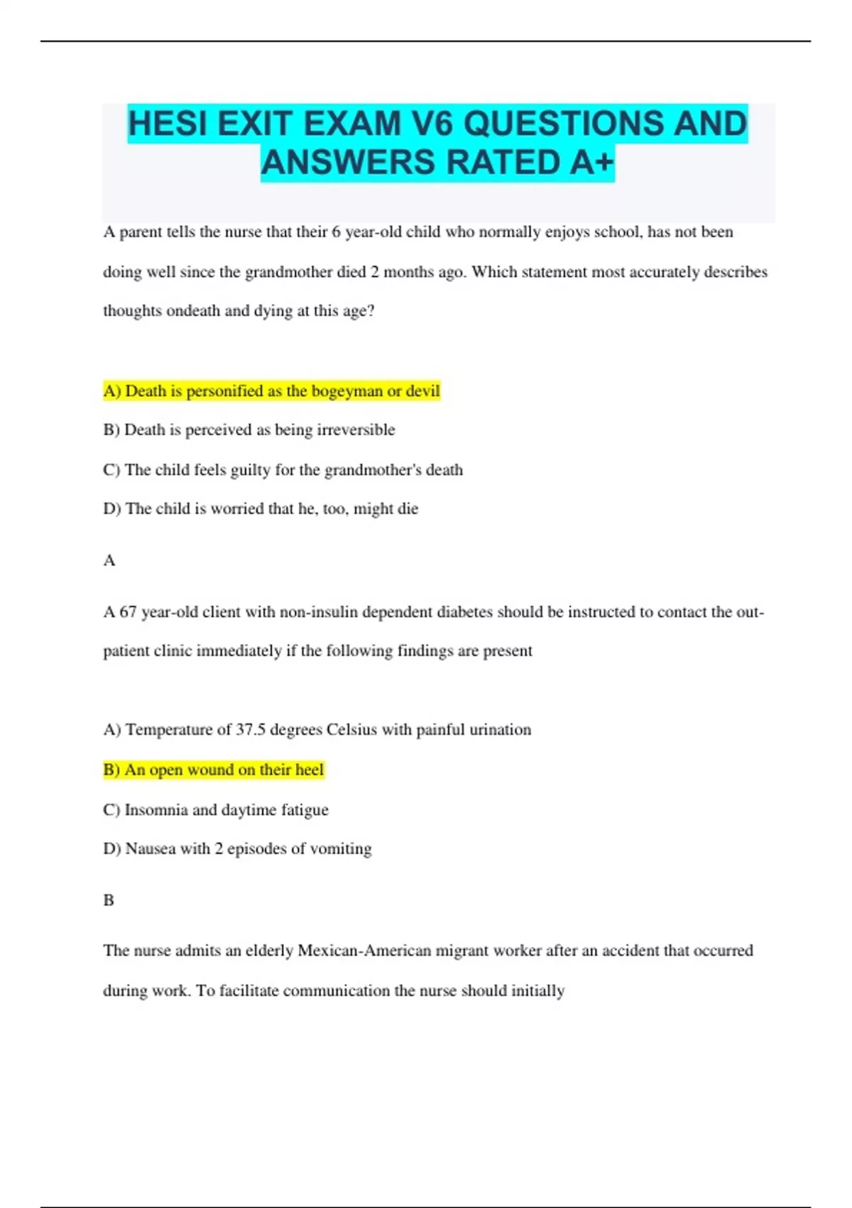 HESI EXIT EXAM V6 QUESTIONS AND ANSWERS RATED A+ A parent tells the nurse that their 6 year-old child who normally enjoys school, has not been doing well since the grandmother died 2 months ago. Which statement most accurately describes thoughts ondeath and dying at this age? A) Death is personified as the bogeyman or devil B) Death is perceived as being irreversible C) The child feels guilty for the grandmother's death D) The child is worried that he, too, might die A A 67 year-old client with non-insulin dependent diabetes should be instructed to contact the out-patient clinic immediately if the following findings are present A) Temperature of 37.5 degrees Celsius with painful urination B) An open wound on their heel C) Insomnia and daytime fatigue D) Nausea with 2 episodes of vomiting B The nurse admits an elderly Mexican-American migrant worker after an accident that occurred during work. To facilitate communication the nurse should initially A) Request a Spanish interpreter B) Speak through the family or co-workers C) Use pictures, letter boards, or monitoring D) Assess the client's ability to speak English D In assessing a post partum client, the nurse palpates a firm fundus and observes a constant trickle of bright red blood from the vagina. What is the most likely cause of these findings? A) Uterine atony B) Genital lacerations C) Retained placenta D) Clotting disorder B The nurse notes an abrupt onset of confusion in an elderly patient. Which of the following recently-ordered medications would most likely contribute to this change? A) Anticoagulant B) Liquid antacid C) Antihistamine D) Cardiac glycoside C The nurse is caring for a client with active tuberculosis who has a history of noncompliance. Which of the following actions by the nurse would represent appropriate care for this client? A) Instruct the client to wear a high efficiency particulate air mask in public places. B) Ask a family member to supervise daily compliance C) Schedule weekly clinic visits for the client D) Ask the health care provider to change the regimen to fewer medications B The nurse manager identifies that time spent by staff in charting is excessive, requiring overtime for completion. The nurse manager states that "staff will form a task force to investigate and develop potential solutions to the problem, and report on this at the next staff meeting." The nurse manager's leadership style is best described as A) Laissez-faire B) Autocratic C) Participative D) Group C A nursing student asks the nurse manager to explain the forces that drive health care reform. The appropriate response by the nurse manager should include A) The escalation of fees with a decreased reimbursement percentage B) High costs of diagnostic and end-of-life treatment procedures C) Increased numbers of elderly and of the chronically ill of all ages D) A steep rise in health care provider fees and in insurance premiums A A client with hepatitis A (HAV) is newly admitted to the unit. Which action would be the priority to include in the plan of care within the initial 24 hours for this client? A) Wear masks with shields if potential splash B) Use disposable utensils and plates for meals C) Wear gown and gloves during client contact D) Provide soft easily digested food with frequent snacks