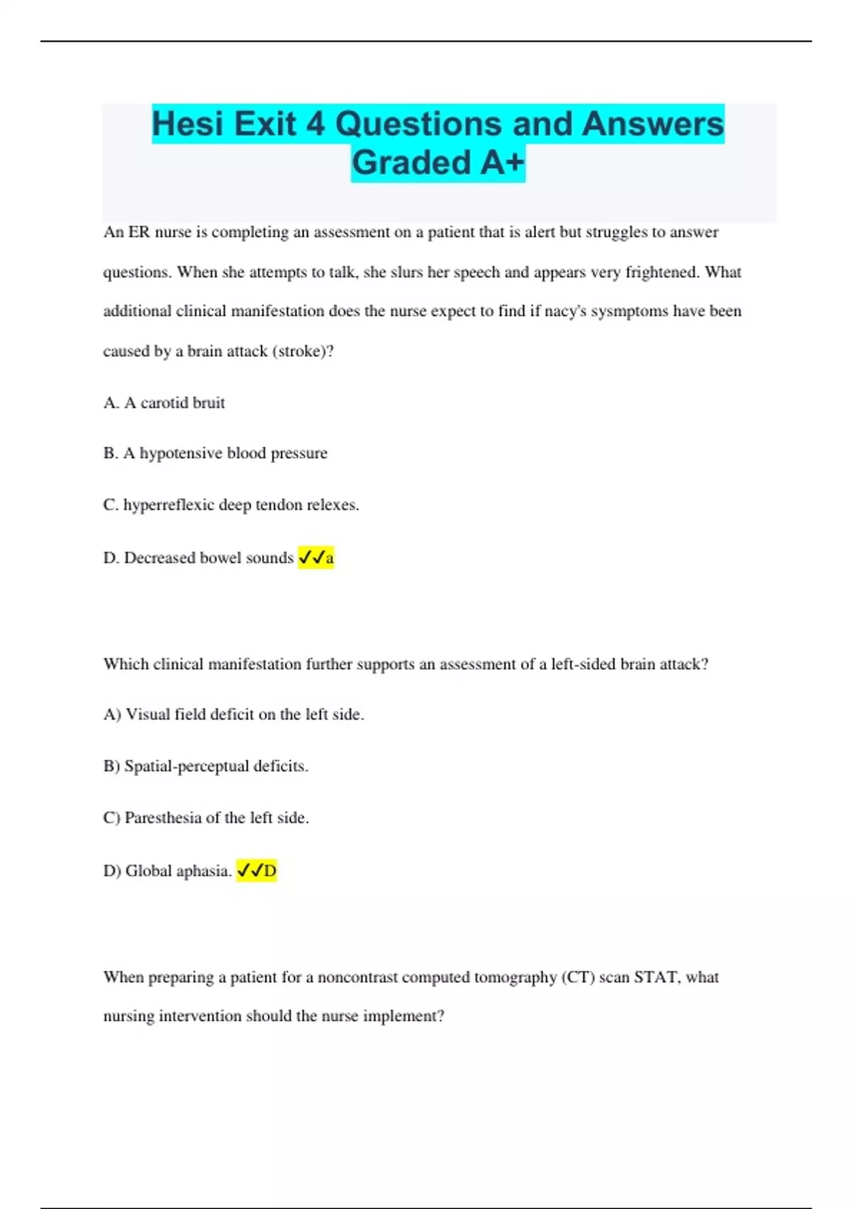 Hesi Exit 4 Questions and Answers Graded A+ An ER nurse is completing an assessment on a patient that is alert but struggles to answer questions. When she attempts to talk, she slurs her speech and appears very frightened. What additional clinical manifestation does the nurse expect to find if nacy's sysmptoms have been caused by a brain attack (stroke)? A. A carotid bruit B. A hypotensive blood pressure C. hyperreflexic deep tendon relexes. D. Decreased bowel sounds a Which clinical manifestation further supports an assessment of a left-sided brain attack? A) Visual field deficit on the left side. B) Spatial-perceptual deficits. C) Paresthesia of the left side. D) Global aphasia. D When preparing a patient for a noncontrast computed tomography (CT) scan STAT, what nursing intervention should the nurse implement? A) Determine if the client has any allergies to iodine B) Explain that the client will not be able to move her head throughout the CT scan. C) Premedicate the client to decrease pain prior to having the procedure. D) Provide an explanation of relaxation exercises prior to the procedure. B A neurologist prescribes a magnetic resonance imaging (MRI) of the head STAT for a patient. Which data warrants immediate intervention by the nurse concerning this diagnostic test? A) Elevated blood pressure. B) Allergy to shell fish. C) Right hip replacement. D) History of atrial fibrillation. C A client's daughter is sitting by her mother's bedside who was recently transferred to the Intermediate Care Unit. She states "I don't understand what a brain attack is. The healthcare provider told me my mother is in serious condition and they are going to run several tests. I just don't know what is going on. What happened to my mother?" What is the best response by the nurse? A) "I am sorry, but according to the Health Insurance Portability and Accounting Act (HIPAA), I cannot give you any information." B) "Your mother has had a stroke, and the blood supply to the brain has been blocked." C) "How do you feel about what the healthcare provider said?" D) "I will call the healthcare provider so he/she can talk to you about your mother's serious condition." B What is the normal range for cardiac output? 4-8L/min A client was admitted with the diagnosis of a brain attack. Their symptoms began 24 hours before being admitted. Why would this client not be a candidate for for thrombolytic therapy? Thrombolytic therapy is contraindicated in clients with symptom onset longer than 3 hours prior to admission. This client had symptoms for 24 hours before being brought to the medical center What are plate guards? Plate guards prevent food from being pushed off the plate. Using plate guards and other assistive devices will encourage independence in a client with a self-care deficit. Which condition is considered a non-modifiable risk factor for a brain attack? A) High cholesterol levels. B) Obesity. C) History of atrial fibrillation. D) Advanced