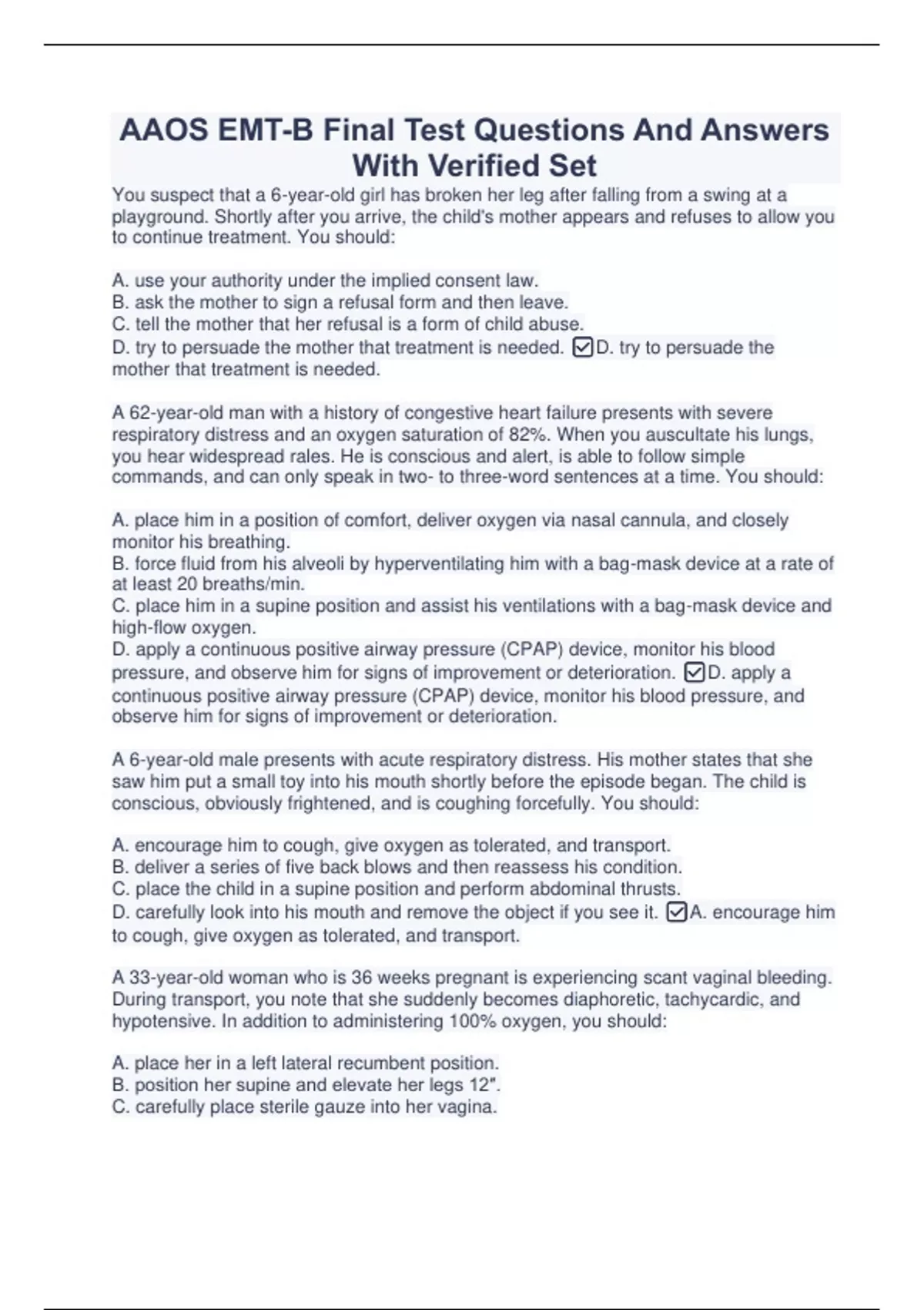 AAOS EMT-B Final Test Questions And Answers With Verified Set AAOS EMT-B Final Test Questions And Answers With Verified Set