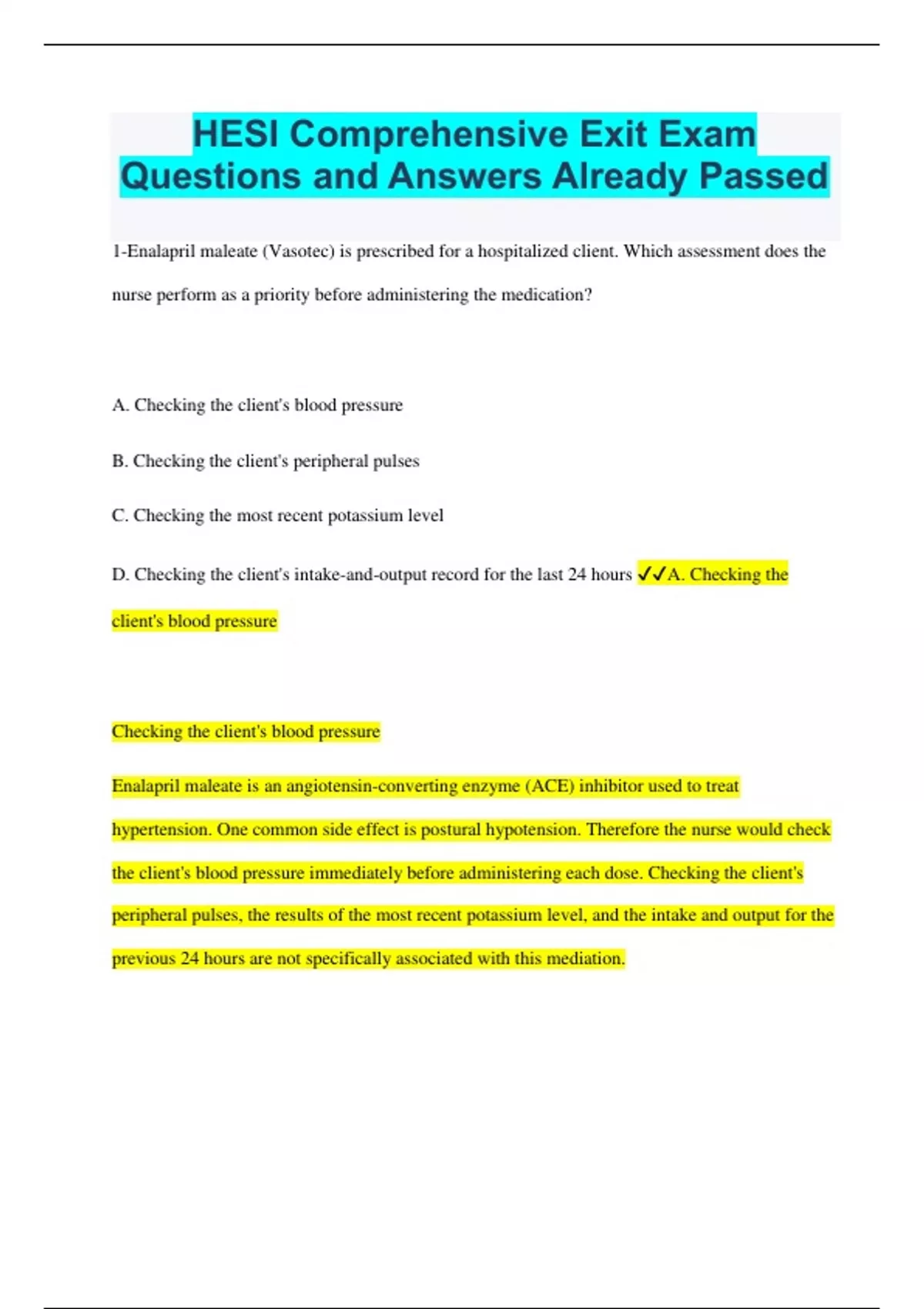HESI Comprehensive Exit Exam Questions and Answers Already Passed 1-Enalapril maleate (Vasotec) is prescribed for a hospitalized client. Which assessment does the nurse perform as a priority before administering the medication? A. Checking the client's blood pressure B. Checking the client's peripheral pulses C. Checking the most recent potassium level D. Checking the client's intake-and-output record for the last 24 hours A. Checking the client's blood pressure Checking the client's blood pressure Enalapril maleate is an angiotensin-converting enzyme (ACE) inhibitor used to treat hypertension. One common side effect is postural hypotension. Therefore the nurse would check the client's blood pressure immediately before administering each dose. Checking the client's peripheral pulses, the results of the most recent potassium level, and the intake and output for the previous 24 hours are not specifically associated with this mediation. 2-A client is scheduled to undergo an upper gastrointestinal (GI) series, and the nurse provides instructions to the client about the test. Which statement by the client indicates a need for further instruction? A. "The test will take about 30 minutes." B. "I need to fast for 8 hours before the test." C. "I need to drink citrate of magnesia the night before the test and give myself a Fleet enema on the morning of the test." D. "I need to take a laxative after the test is completed, because the liquid that I'll have to drink for the test can be constipating." C. "I need to drink citrate of magnesia the night before the test and give myself a Fleet enema on the morning of the test." An upper GI series involves visualization of the esophagus, duodenum, and upper jejunum by means of the use of a contrast medium. It involves swallowing a contrast medium (usually barium), which is administered in a flavored milkshake. Films are taken at intervals during the test, which takes about 30 minutes. No special preparation is necessary before a GI series, except that NPO status must be maintained for 8 hours before the test. After an upper GI series, the client is prescribed a laxative to hasten elimination of the barium. Barium that remains in the colon may become hard and difficult to expel, leading to fecal impaction. 3-A nurse on the evening shift checks a physician's prescriptions and notes that the dose of a prescribed medication is higher than the normal dose. The nurse calls the physician's answering service and is told that the physician is off for the night and will be available in the morning. The nurse should: A. Call the nursing supervisor B. Ask the answering service to contact the on-call physician C. Withhold the medication until the physician can be reached in the morning D. Administer the medication but consult the physician when he becomes available B. Ask the answering service to contact the on-call physician 4.An emergency department (ED) nurse is monitoring a client with suspected acute myocardial infarction (MI) who is awaiting transfer to the coronary intensive care unit. The nurse notes the sudden onset of premature ventricular contractions (PVCs) on the monitor, checks the client's carotid pulse, and determines that the PVCs are not resulting in perfusion. The appropriate action by the nurse is: A. Documenting the findings B. Asking the ED physician to check the client C. Continuing to monitor the client's cardiac status D. Informing the client that PVCs are expected after an MI B. Asking the ED physician to check the client 5.NPO status is imposed 8 hours before the procedure on a client scheduled to undergo electroconvulsive therapy (ECT) at 1 p.m. On the morning of the procedure, the nurse checks the client's record and notes that the client routinely takes an oral antihypertensive medication each morning. The nurse should: A. Administer the antihypertensive with a small sip of water B. Withhold the antihypertensive and administer it at bedtim