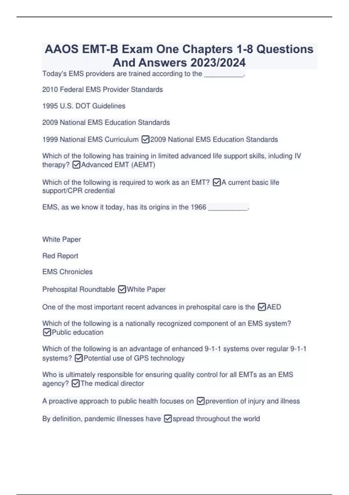 AAOS EMT-B Exam One Chapters 1-8 Questions And Answers 2023/2024 AAOS EMT-B Exam One Chapters 1-8 Questions And Answers 2023/2024