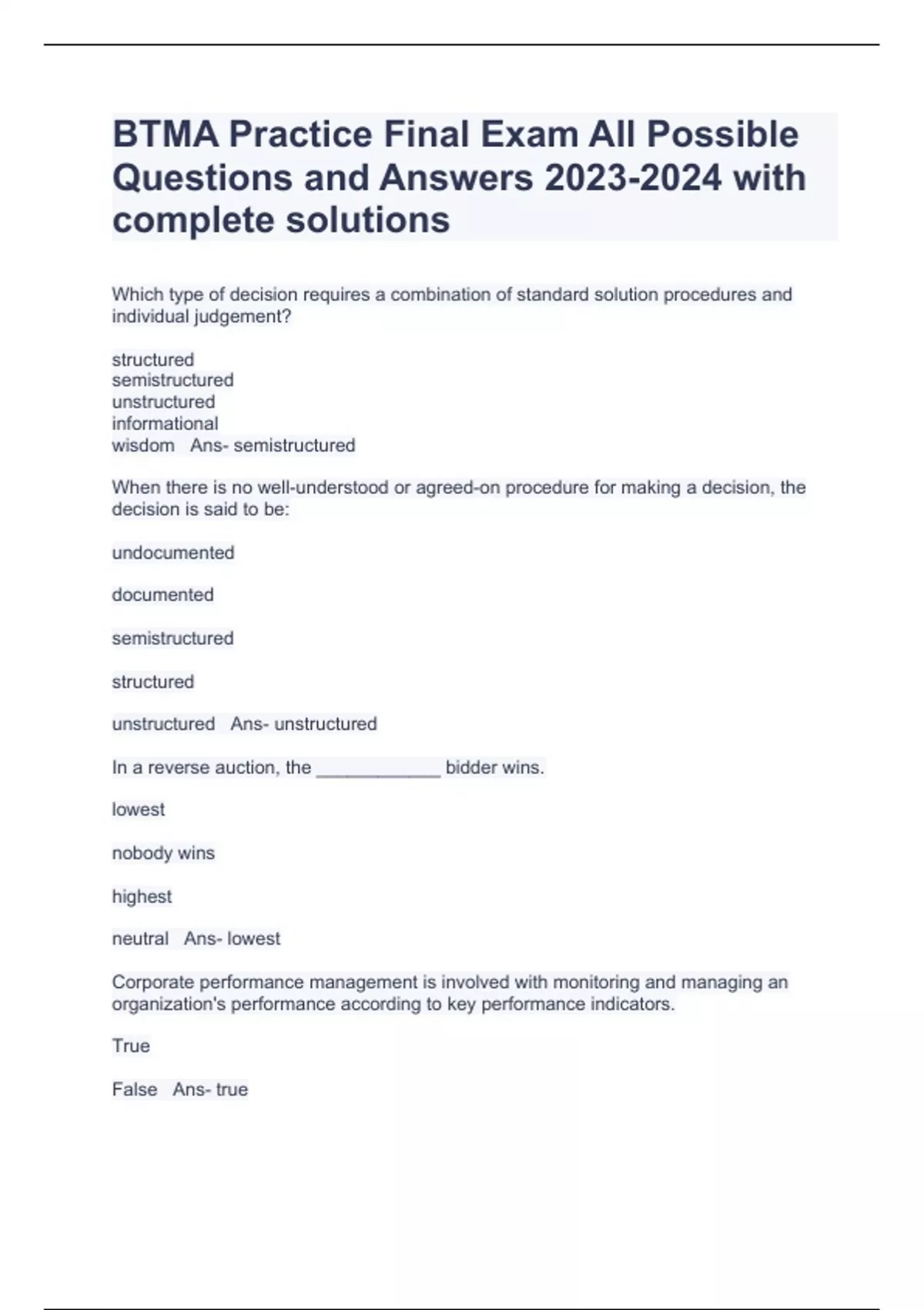 BTMA Practice Final Exam All Possible Questions and Answers with complete solutions