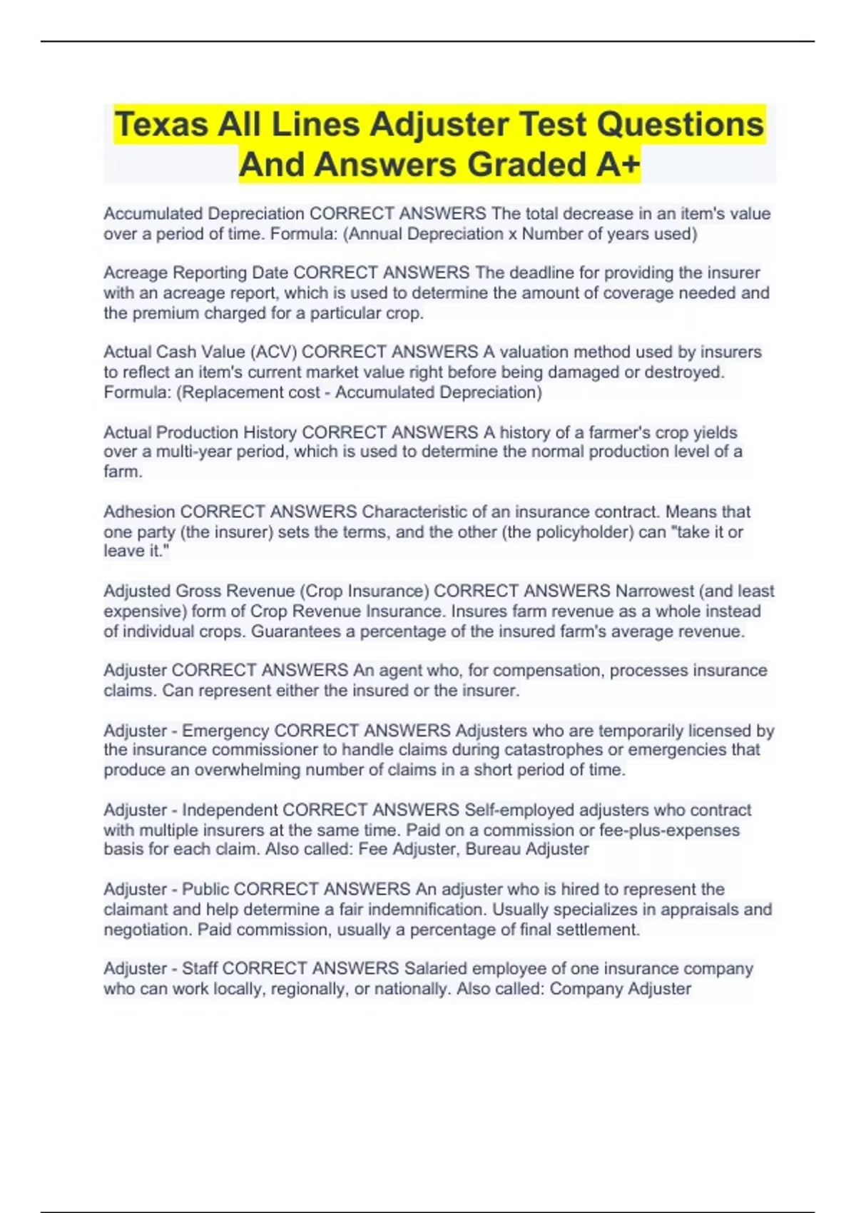 Texas All Lines Adjuster Test Questions And Answers Graded A+
