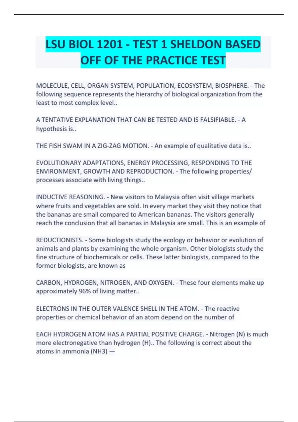 LSU BIOL 1201 - TEST 1 SHELDON BASED OFF OF THE PRACTICE TEST