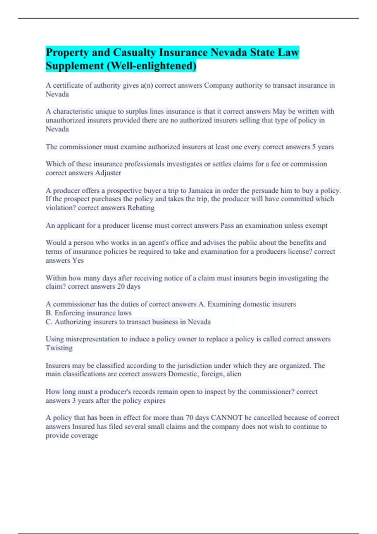 A certificate of authority gives a(n) correct answers Company authority to transact insurance in Nevada A characteristic unique to surplus lines insurance is that it correct answers May be written with unauthorized insurers provided there are no authorized insurers selling that type of policy in Nevada The commissioner must examine authorized insurers at least one every correct answers 5 years Which of these insurance professionals investigates or settles claims for a fee or commission correct answers Adjuster A producer offers a prospective buyer a trip to Jamaica in order the persuade him to buy a policy. If the prospect purchases the policy and takes the trip, the producer will have committed which violation? correct answers Rebating An applicant for a producer license must correct answers Pass an examination unless exempt Would a person who works in an agent's office and advises the public about the benefits and terms of insurance policies be required to take and examination for a producers license? correct answers Yes Within how many days after receiving notice of a claim must insurers begin investigating the claim? correct answers 20 days A commissioner has the duties of correct answers A. Examining domestic insurers B. Enforcing insurance laws C. Authorizing insurers to transact business in Nevada Using misrepresentation to induce a policy owner to replace a policy is called correct answers Twisting Insurers may be classified according to the jurisdiction under which they are organized. The main classifications are correct answers Domestic, foreign, alien How long must a producer's records remain open to inspect by the commissioner? correct answers 3 years after the policy expires A policy that has been in effect for more than 70 days CANNOT be cancelled because of correct answers Insured has filed several small claims and the company does not wish to continue to provide coverage