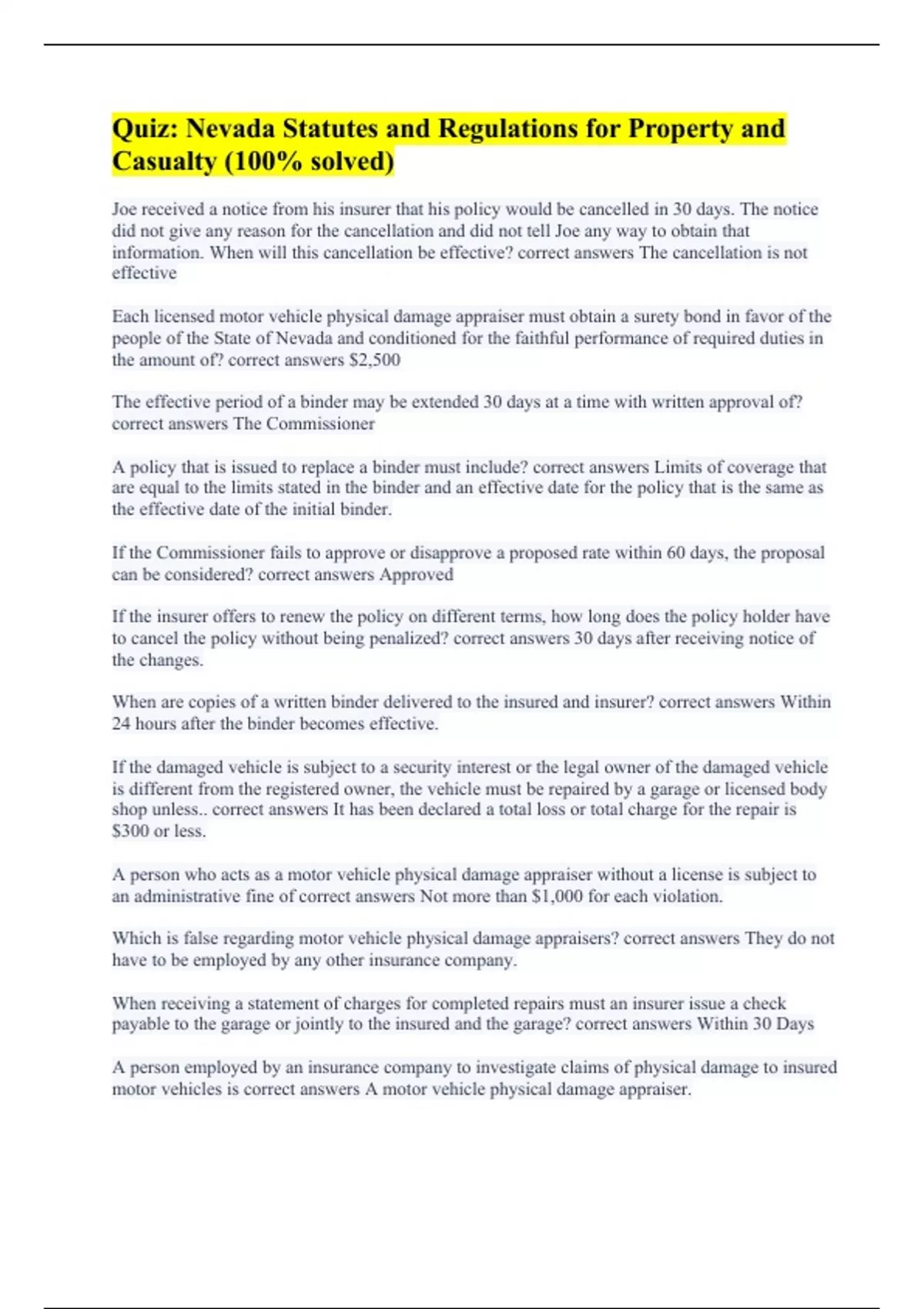 Quiz: Nevada Statutes and Regulations for Property and Casualty (100% solved)