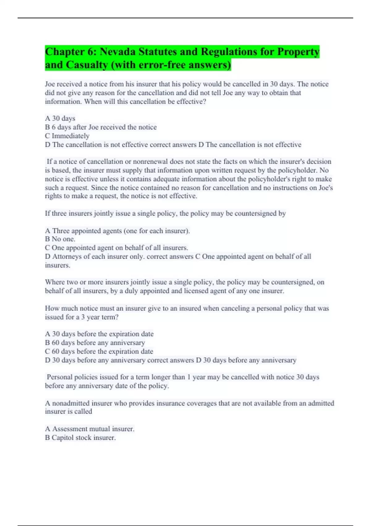 Joe received a notice from his insurer that his policy would be cancelled in 30 days. The notice did not give any reason for the cancellation and did not tell Joe any way to obtain that information. When will this cancellation be effective? A 30 days B 6 days after Joe received the notice C Immediately D The cancellation is not effective correct answers D The cancellation is not effective If a notice of cancellation or nonrenewal does not state the facts on which the insurer's decision is based, the insurer must supply that information upon written request by the policyholder. No notice is effective unless it contains adequate information about the policyholder's right to make such a request. Since the notice contained no reason for cancellation and no instructions on Joe's rights to make a request, the notice is not effective. If three insurers jointly issue a single policy, the policy may be countersigned by A Three appointed agents (one for each insurer). B No one. C One appointed agent on behalf of all insurers. D Attorneys of each insurer only. correct answers C One appointed agent on behalf of all insurers. Where two or more insurers jointly issue a single policy, the policy may be countersigned, on behalf of all insurers, by a duly appointed and licensed agent of any one insurer. How much notice must an insurer give to an insured when canceling a personal policy that was issued for a 3 year term? A 30 days before the expiration date B 60 days before any anniversary C 60 days before the expiration date D 30 days before any anniversary correct answers D 30 days before any anniversary Personal policies issued for a term longer than 1 year may be cancelled with notice 30 days before any anniversary date of the policy. A nonadmitted insurer who provides insurance coverages that are not available from an admitted insurer is called A Assessment mutual insurer. B Capitol stock insurer.