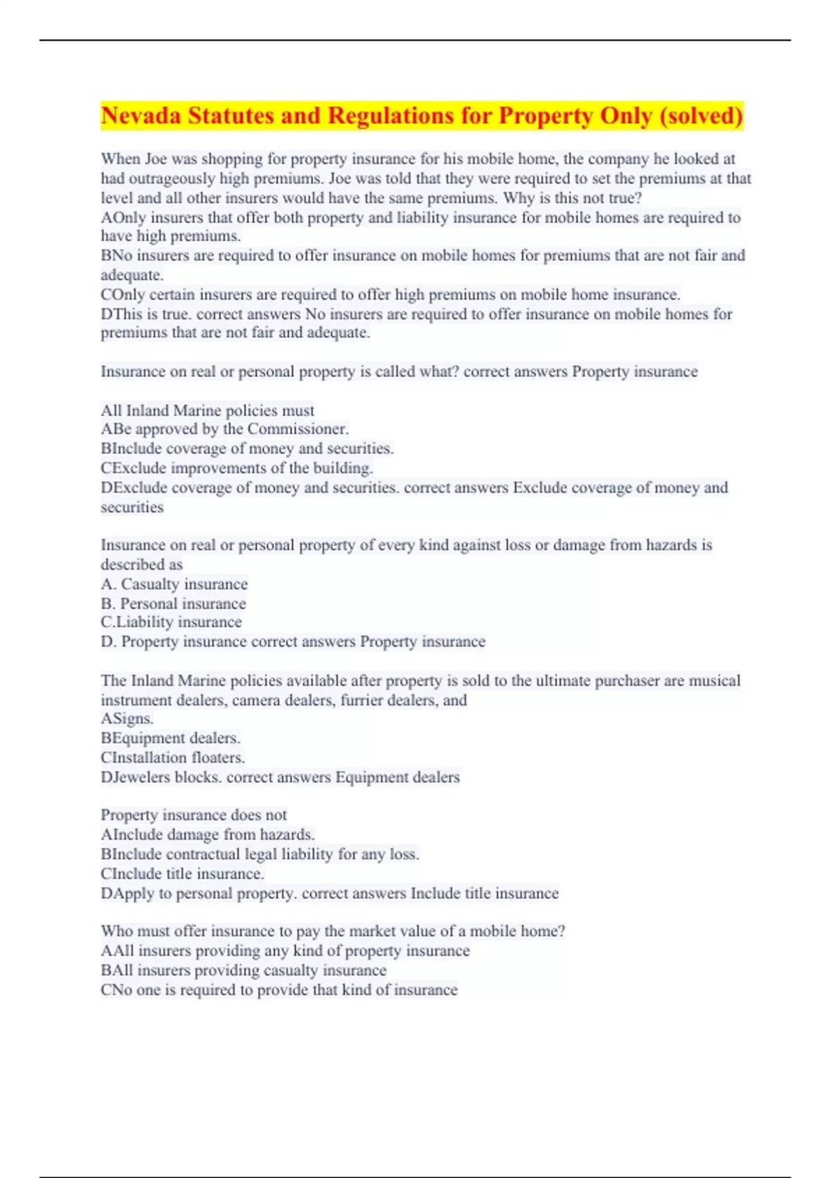 When Joe was shopping for property insurance for his mobile home, the company he looked at had outrageously high premiums. Joe was told that they were required to set the premiums at that level and all other insurers would have the same premiums. Why is this not true? AOnly insurers that offer both property and liability insurance for mobile homes are required to have high premiums. BNo insurers are required to offer insurance on mobile homes for premiums that are not fair and adequate. COnly certain insurers are required to offer high premiums on mobile home insurance. DThis is true. correct answers No insurers are required to offer insurance on mobile homes for premiums that are not fair and adequate. Insurance on real or personal property is called what? correct answers Property insurance All Inland Marine policies must ABe approved by the Commissioner. BInclude coverage of money and securities. CExclude improvements of the building. DExclude coverage of money and securities. correct answers Exclude coverage of money and securities Insurance on real or personal property of every kind against loss or damage from hazards is described as A. Casualty insurance B. Personal insurance C.Liability insurance D. Property insurance correct answers Property insurance The Inland Marine policies available after property is sold to the ultimate purchaser are musical instrument dealers, camera dealers, furrier dealers, and ASigns. BEquipment dealers. CInstallation floaters. DJewelers blocks. correct answers Equipment dealers Property insurance does not AInclude damage from hazards. BInclude contractual legal liability for any loss. CInclude title insurance. DApply to personal property. correct answers Include title insurance Who must offer insurance to pay the market value of a mobile home? AAll insurers providing any kind of property insurance BAll insurers providing casualty insurance CNo one is required to provide that kind of insurance