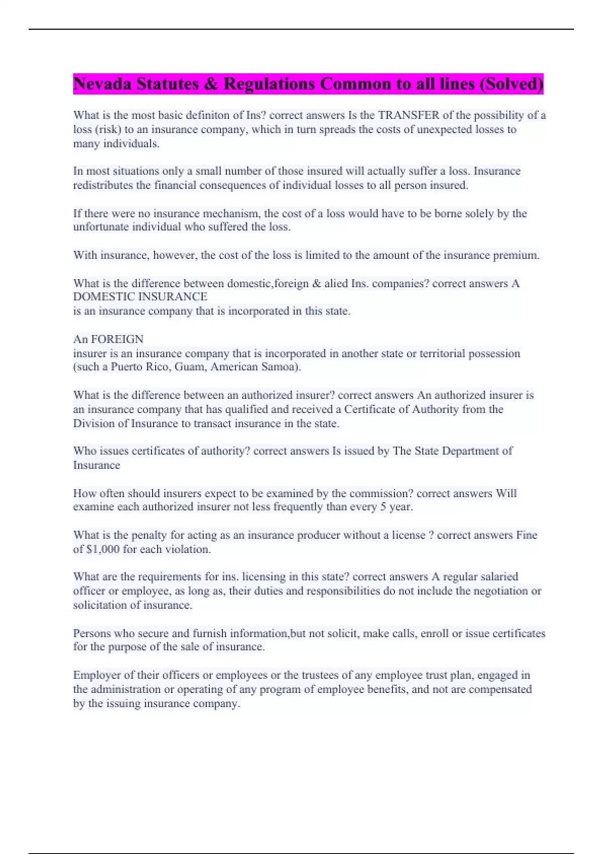 What is the most basic definiton of Ins? correct answers Is the TRANSFER of the possibility of a loss (risk) to an insurance company, which in turn spreads the costs of unexpected losses to many individuals. In most situations only a small number of those insured will actually suffer a loss. Insurance redistributes the financial consequences of individual losses to all person insured. If there were no insurance mechanism, the cost of a loss would have to be borne solely by the unfortunate individual who suffered the loss. With insurance, however, the cost of the loss is limited to the amount of the insurance premium. What is the difference between domestic,foreign & alied Ins. companies? correct answers A DOMESTIC INSURANCE is an insurance company that is incorporated in this state. An FOREIGN insurer is an insurance company that is incorporated in another state or territorial possession (such a Puerto Rico, Guam, American Samoa). What is the difference between an authorized insurer? correct answers An authorized insurer is an insurance company that has qualified and received a Certificate of Authority from the Division of Insurance to transact insurance in the state. Who issues certificates of authority? correct answers Is issued by The State Department of Insurance How often should insurers expect to be examined by the commission? correct answers Will examine each authorized insurer not less frequently than every 5 year. What is the penalty for acting as an insurance producer without a license ? correct answers Fine of $1,000 for each violation. What are the requirements for ins. licensing in this state? correct answers A regular salaried officer or employee, as long as, their duties and responsibilities do not include the negotiation or solicitation of insurance. Persons who secure and furnish information,but not solicit, make calls, enroll or issue certificates for the purpose of the sale of insurance. Employer of their officers or employees or the trustees of any employee trust plan, engaged in the administration or operating of any program of employee benefits, and not are compensated by the issuing insurance company.