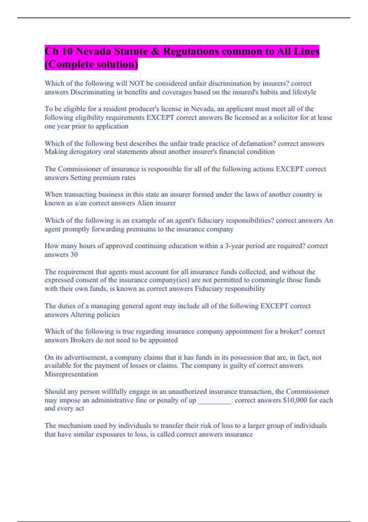 Ch 10 Nevada Statute & Regulations common to All Lines (Complete solution)