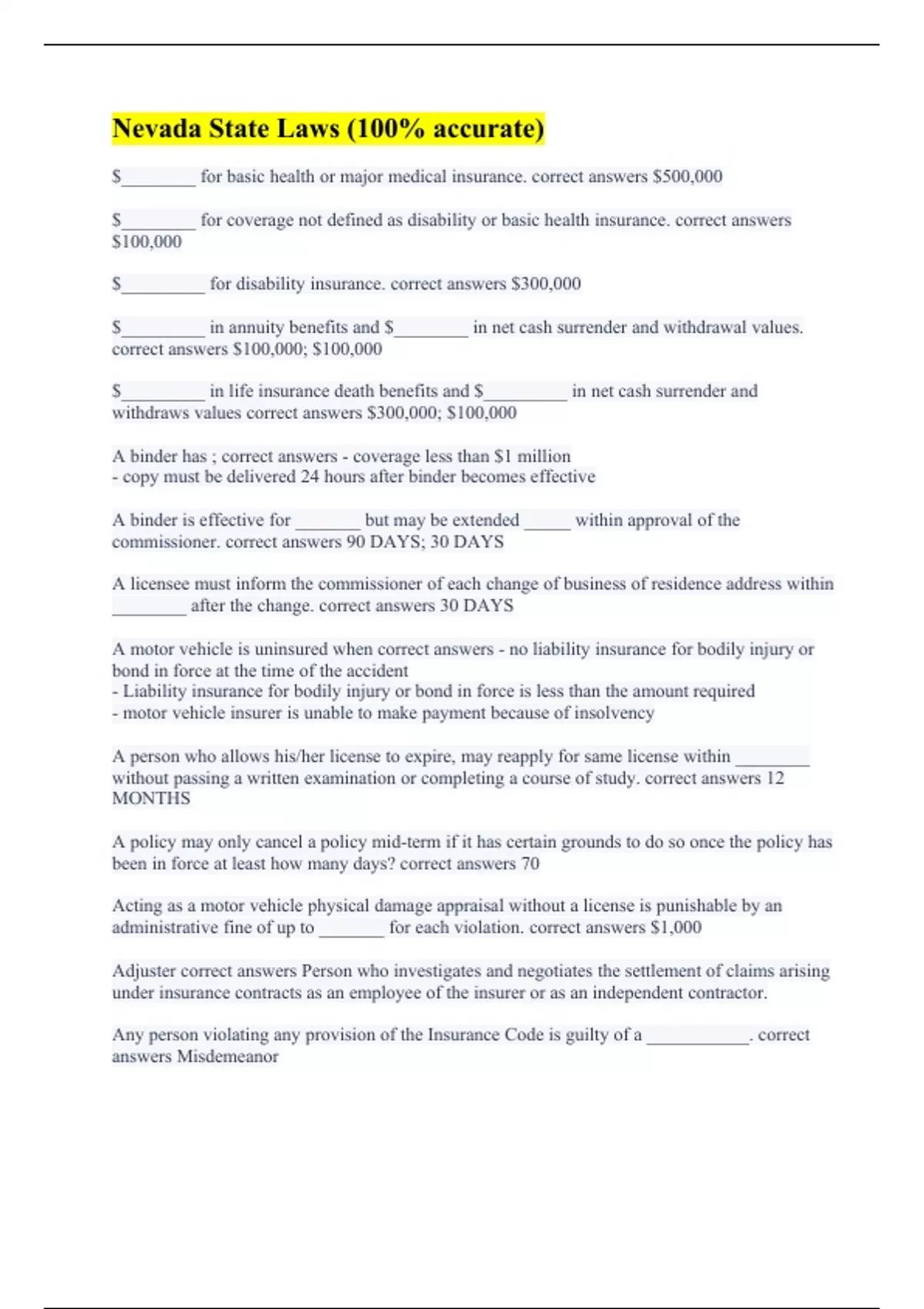 $________ for basic health or major medical insurance. correct answers $500,000 $________ for coverage not defined as disability or basic health insurance. correct answers $100,000 $_________ for disability insurance. correct answers $300,000 $_________ in annuity benefits and $________ in net cash surrender and withdrawal values. correct answers $100,000; $100,000 $_________ in life insurance death benefits and $_________ in net cash surrender and withdraws values correct answers $300,000; $100,000 A binder has ; correct answers - coverage less than $1 million - copy must be delivered 24 hours after binder becomes effective A binder is effective for _______ but may be extended _____ within approval of the commissioner. correct answers 90 DAYS; 30 DAYS A licensee must inform the commissioner of each change of business of residence address within ________ after the change. correct answers 30 DAYS A motor vehicle is uninsured when correct answers - no liability insurance for bodily injury or bond in force at the time of the accident - Liability insurance for bodily injury or bond in force is less than the amount required - motor vehicle insurer is unable to make payment because of insolvency A person who allows his/her license to expire, may reapply for same license within ________ without passing a written examination or completing a course of study. correct answers 12 MONTHS A policy may only cancel a policy mid-term if it has certain grounds to do so once the policy has been in force at least how many days? correct answers 70 Acting as a motor vehicle physical damage appraisal without a license is punishable by an administrative fine of up to _______ for each violation. correct answers $1,000 Adjuster correct answers Person who investigates and negotiates the settlement of claims arising under insurance contracts as an employee of the insurer or as an independent contractor. Any person violating any provision of the Insurance Code is guilty of a ___________. correct answers Misdemeanor