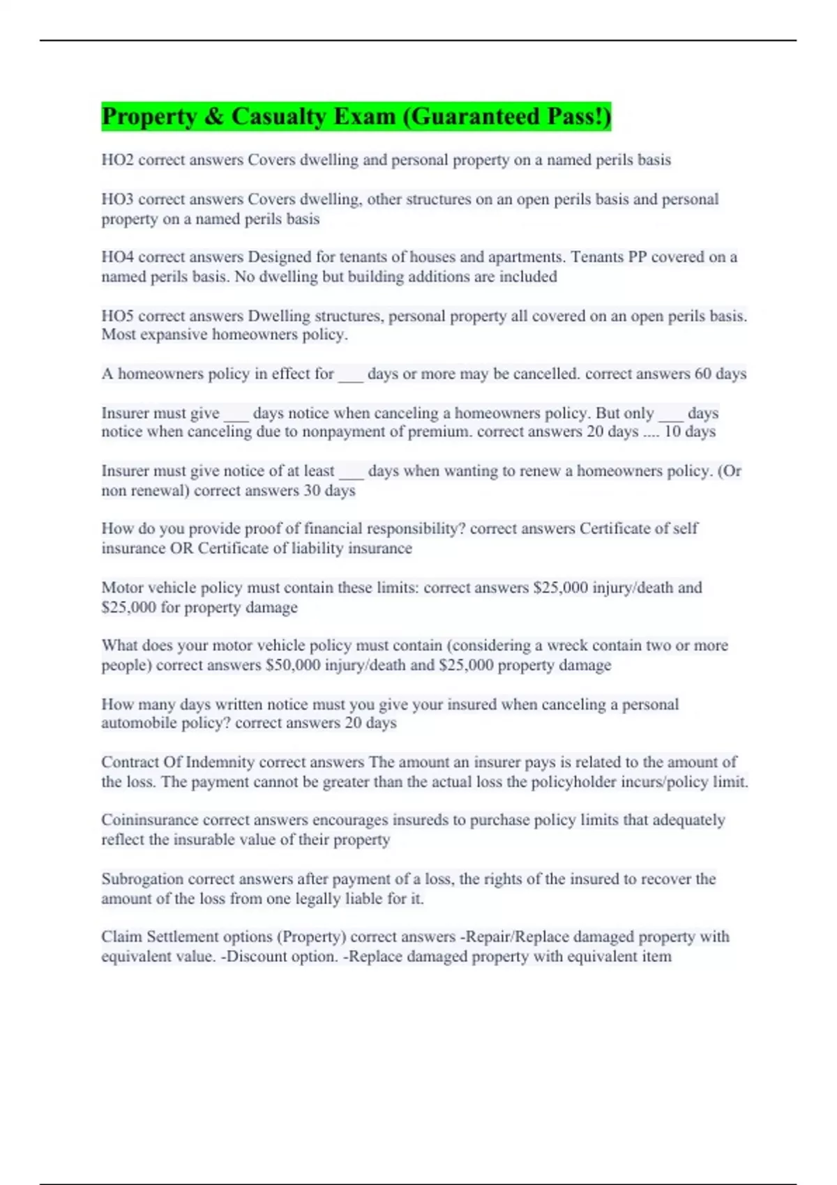 HO2 correct answers Covers dwelling and personal property on a named perils basis HO3 correct answers Covers dwelling, other structures on an open perils basis and personal property on a named perils basis HO4 correct answers Designed for tenants of houses and apartments. Tenants PP covered on a named perils basis. No dwelling but building additions are included HO5 correct answers Dwelling structures, personal property all covered on an open perils basis. Most expansive homeowners policy. A homeowners policy in effect for ___ days or more may be cancelled. correct answers 60 days Insurer must give ___ days notice when canceling a homeowners policy. But only ___ days notice when canceling due to nonpayment of premium. correct answers 20 days .... 10 days Insurer must give notice of at least ___ days when wanting to renew a homeowners policy. (Or non renewal) correct answers 30 days How do you provide proof of financial responsibility? correct answers Certificate of self insurance OR Certificate of liability insurance Motor vehicle policy must contain these limits: correct answers $25,000 injury/death and $25,000 for property damage What does your motor vehicle policy must contain (considering a wreck contain two or more people) correct answers $50,000 injury/death and $25,000 property damage How many days written notice must you give your insured when canceling a personal automobile policy? correct answers 20 days Contract Of Indemnity correct answers The amount an insurer pays is related to the amount of the loss. The payment cannot be greater than the actual loss the policyholder incurs/policy limit. Coininsurance correct answers encourages insureds to purchase policy limits that adequately reflect the insurable value of their property Subrogation correct answers after payment of a loss, the rights of the insured to recover the amount of the loss from one legally liable for it. Claim Settlement options (Property) correct answers -Repair/Replace damaged property with equivalent value. -Discount option. -Replace damaged property with equivalent item