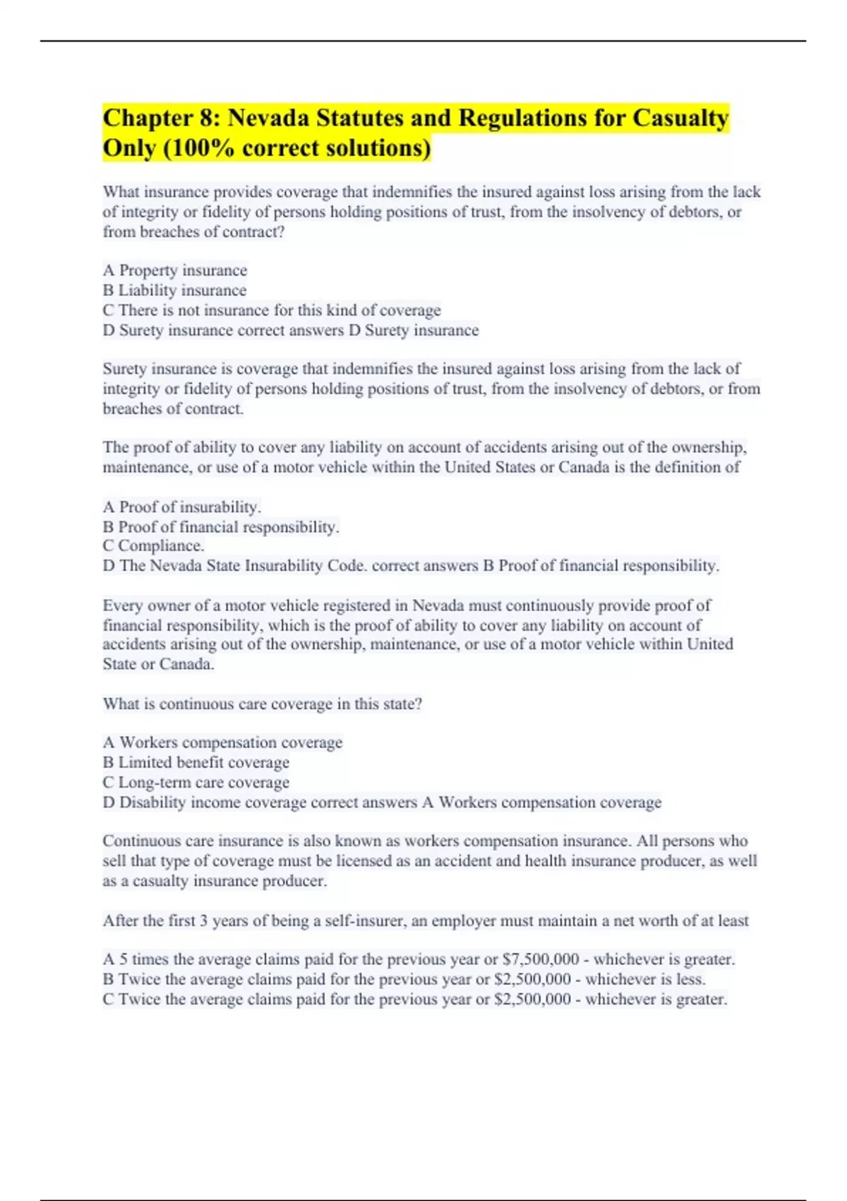 What insurance provides coverage that indemnifies the insured against loss arising from the lack of integrity or fidelity of persons holding positions of trust, from the insolvency of debtors, or from breaches of contract? A Property insurance B Liability insurance C There is not insurance for this kind of coverage D Surety insurance correct answers D Surety insurance Surety insurance is coverage that indemnifies the insured against loss arising from the lack of integrity or fidelity of persons holding positions of trust, from the insolvency of debtors, or from breaches of contract. The proof of ability to cover any liability on account of accidents arising out of the ownership, maintenance, or use of a motor vehicle within the United States or Canada is the definition of A Proof of insurability. B Proof of financial responsibility. C Compliance. D The Nevada State Insurability Code. correct answers B Proof of financial responsibility. Every owner of a motor vehicle registered in Nevada must continuously provide proof of financial responsibility, which is the proof of ability to cover any liability on account of accidents arising out of the ownership, maintenance, or use of a motor vehicle within United State or Canada. What is continuous care coverage in this state? A Workers compensation coverage B Limited benefit coverage C Long-term care coverage D Disability income coverage correct answers A Workers compensation coverage Continuous care insurance is also known as workers compensation insurance. All persons who sell that type of coverage must be licensed as an accident and health insurance producer, as well as a casualty insurance producer. After the first 3 years of being a self-insurer, an employer must maintain a net worth of at least A 5 times the average claims paid for the previous year or $7,500,000 - whichever is greater. B Twice the average claims paid for the previous year or $2,500,000 - whichever is less. C Twice the average claims paid for the previous year or $2,500,000 - whichever is greater