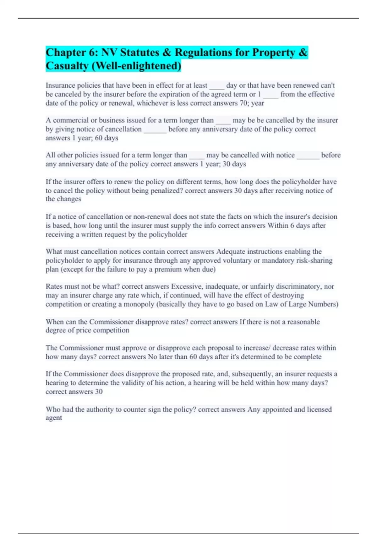 Insurance policies that have been in effect for at least ____ day or that have been renewed can't be canceled by the insurer before the expiration of the agreed term or 1 ____ from the effective date of the policy or renewal, whichever is less correct answers 70; year A commercial or business issued for a term longer than ____ may be be cancelled by the insurer by giving notice of cancellation ______ before any anniversary date of the policy correct answers 1 year; 60 days All other policies issued for a term longer than ____ may be cancelled with notice ______ before any anniversary date of the policy correct answers 1 year; 30 days If the insurer offers to renew the policy on different terms, how long does the policyholder have to cancel the policy without being penalized? correct answers 30 days after receiving notice of the changes If a notice of cancellation or non-renewal does not state the facts on which the insurer's decision is based, how long until the insurer must supply the info correct answers Within 6 days after receiving a written request by the policyholder What must cancellation notices contain correct answers Adequate instructions enabling the policyholder to apply for insurance through any approved voluntary or mandatory risk-sharing plan (except for the failure to pay a premium when due) Rates must not be what? correct answers Excessive, inadequate, or unfairly discriminatory, nor may an insurer charge any rate which, if continued, will have the effect of destroying competition or creating a monopoly (basically they have to go based on Law of Large Numbers) When can the Commissioner disapprove rates? correct answers If there is not a reasonable degree of price competition The Commissioner must approve or disapprove each proposal to increase/ decrease rates within how many days? correct answers No later than 60 days after it's determined to be complete If the Commissioner does disapprove the proposed rate, and, subsequently, an insurer requests a hearing to determine the validity of his action, a hearing will be held within how many days? correct answers 30 Who had the authority to counter sign the policy? correct answers Any appointed and licensed agent