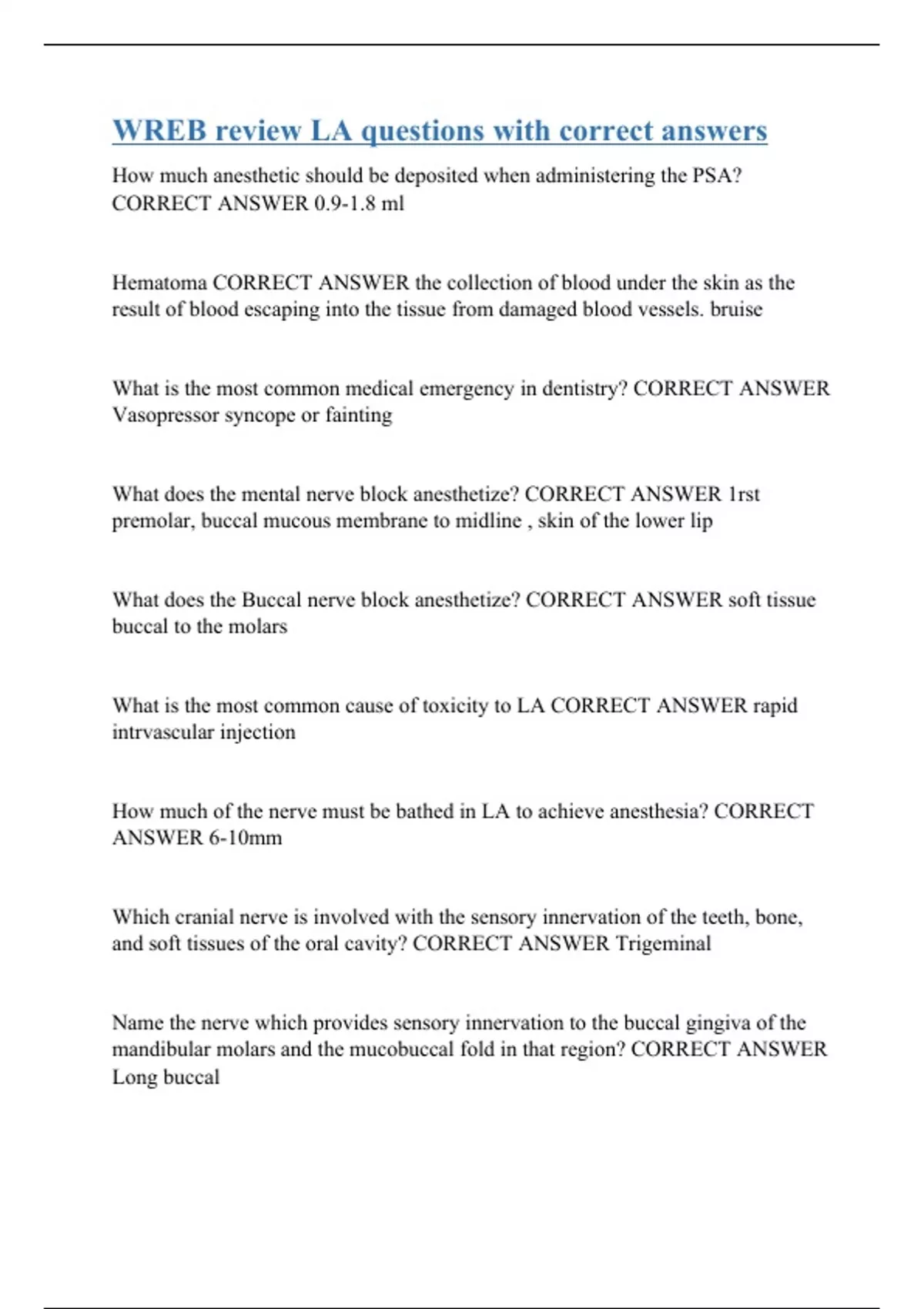 How much anesthetic should be deposited when administering the PSA? CORRECT ANSWER 0.9-1.8 ml Hematoma CORRECT ANSWER the collection of blood under the skin as the result of blood escaping into the tissue from damaged blood vessels. bruise What is the most common medical emergency in dentistry? CORRECT ANSWER Vasopressor syncope or fainting What does the mental nerve block anesthetize? CORRECT ANSWER 1rst premolar, buccal mucous membrane to midline , skin of the lower lip What does the Buccal nerve block anesthetize? CORRECT ANSWER soft tissue buccal to the molars What is the most common cause of toxicity to LA CORRECT ANSWER rapid intrvascular injection How much of the nerve must be bathed in LA to achieve anesthesia? CORRECT ANSWER 6-10mm Which cranial nerve is involved with the sensory innervation of the teeth, bone, and soft tissues of the oral cavity? CORRECT ANSWER Trigeminal Name the nerve which provides sensory innervation to the buccal gingiva of the mandibular molars and the mucobuccal fold in that region? CORRECT ANSWER Long buccal