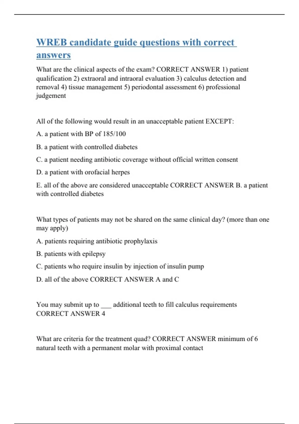What are the clinical aspects of the exam? CORRECT ANSWER 1) patient qualification 2) extraoral and intraoral evaluation 3) calculus detection and removal 4) tissue management 5) periodontal assessment 6) professional judgement All of the following would result in an unacceptable patient EXCEPT: A. a patient with BP of 185/100 B. a patient with controlled diabetes C. a patient needing antibiotic coverage without official written consent D. a patient with orofacial herpes E. all of the above are considered unacceptable CORRECT ANSWER B. a patient with controlled diabetes What types of patients may not be shared on the same clinical day? (more than one may apply) A. patients requiring antibiotic prophylaxis B. patients with epilepsy C. patients who require insulin by injection of insulin pump D. all of the above CORRECT ANSWER A and C You may submit up to ___ additional teeth to fill calculus requirements CORRECT ANSWER 4