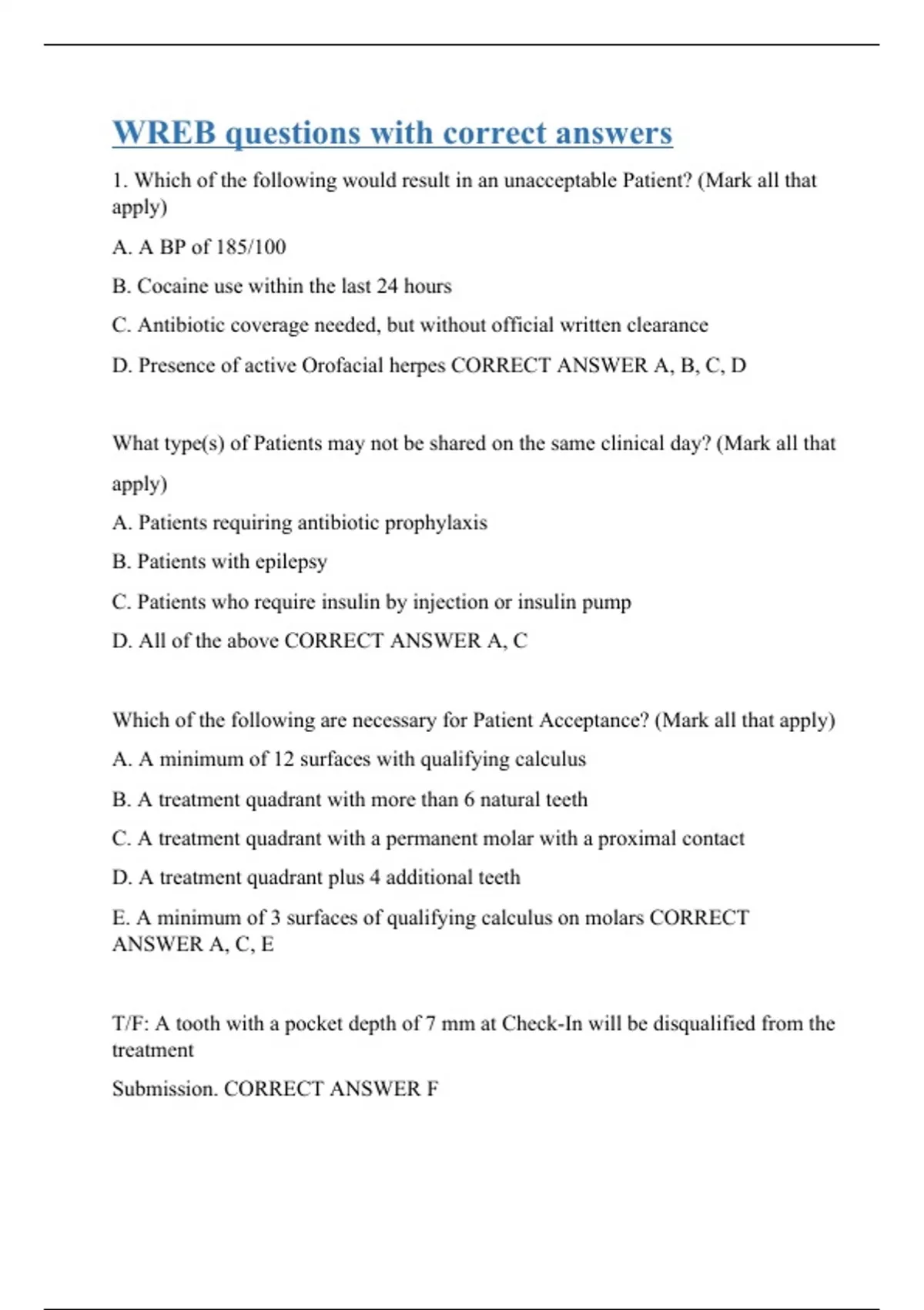 1. Which of the following would result in an unacceptable Patient? (Mark all that apply) A. A BP of 185/100 B. Cocaine use within the last 24 hours C. Antibiotic coverage needed, but without official written clearance D. Presence of active Orofacial herpes CORRECT ANSWER A, B, C, D What type(s) of Patients may not be shared on the same clinical day? (Mark all that apply) A. Patients requiring antibiotic prophylaxis B. Patients with epilepsy C. Patients who require insulin by injection or insulin pump D. All of the above CORRECT ANSWER A, C Which of the following are necessary for Patient Acceptance? (Mark all that apply) A. A minimum of 12 surfaces with qualifying calculus B. A treatment quadrant with more than 6 natural teeth C. A treatment quadrant with a permanent molar with a proximal contact D. A treatment quadrant plus 4 additional teeth E. A minimum of 3 surfaces of qualifying calculus on molars CORRECT ANSWER A, C, E T/F: A tooth with a pocket depth of 7 mm at Check-In will be disqualified from the treatment Submission. CORRECT ANSWER F