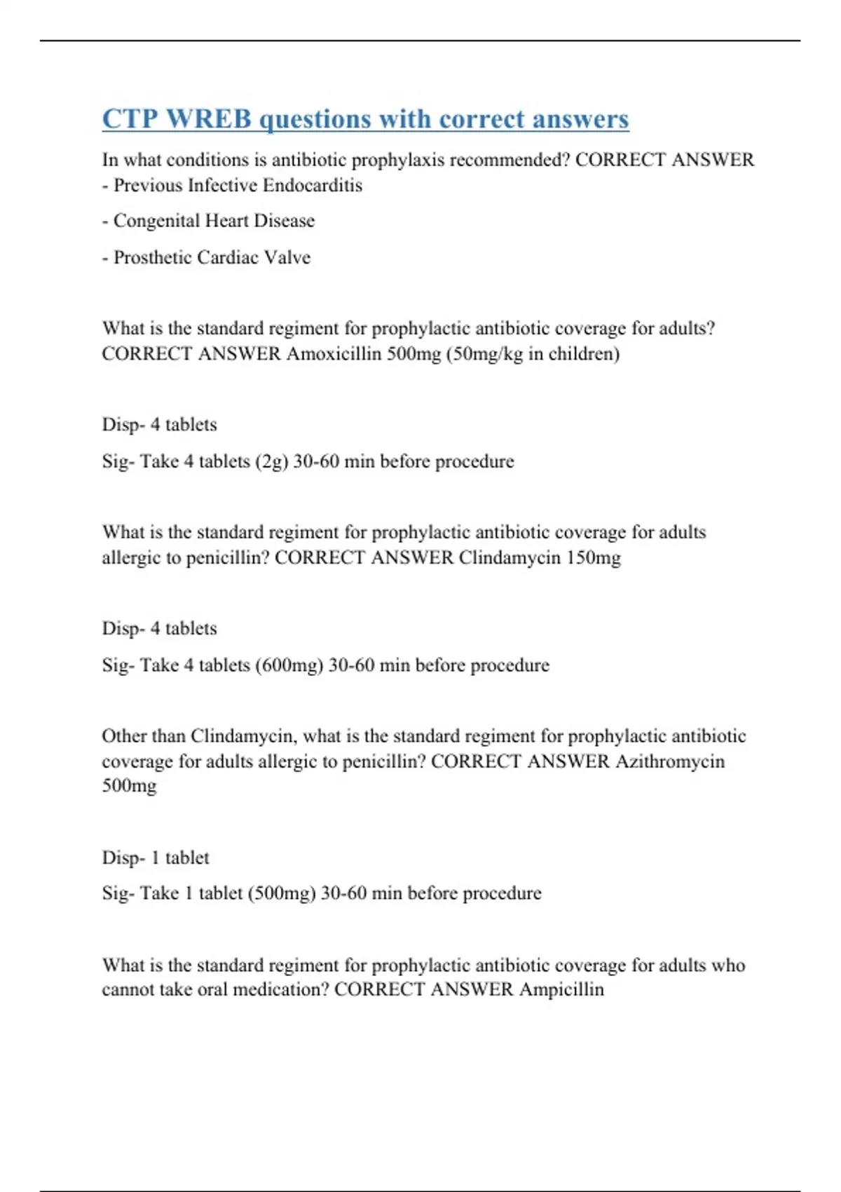 In what conditions is antibiotic prophylaxis recommended? CORRECT ANSWER - Previous Infective Endocarditis - Congenital Heart Disease - Prosthetic Cardiac Valve What is the standard regiment for prophylactic antibiotic coverage for adults? CORRECT ANSWER Amoxicillin 500mg (50mg/kg in children) Disp- 4 tablets Sig- Take 4 tablets (2g) 30-60 min before procedure What is the standard regiment for prophylactic antibiotic coverage for adults allergic to penicillin? CORRECT ANSWER Clindamycin 150mg Disp- 4 tablets Sig- Take 4 tablets (600mg) 30-60 min before procedure Other than Clindamycin, what is the standard regiment for prophylactic antibiotic coverage for adults allergic to penicillin? CORRE