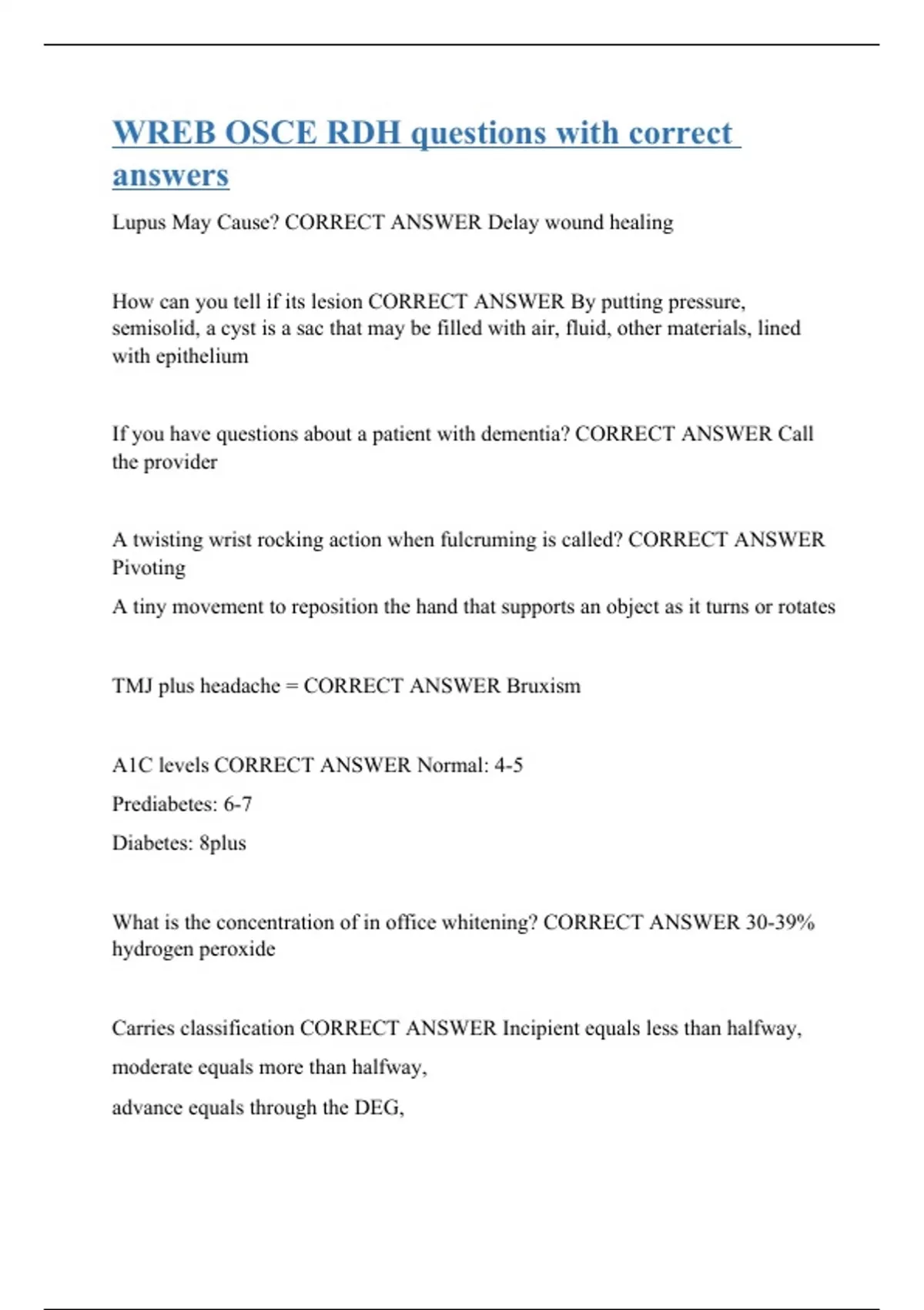 Lupus May Cause? CORRECT ANSWER Delay wound healing How can you tell if its lesion CORRECT ANSWER By putting pressure, semisolid, a cyst is a sac that may be filled with air, fluid, other materials, lined with epithelium If you have questions about a patient with dementia? CORRECT ANSWER Call the provider A twisting wrist rocking action when fulcruming is called? CORRECT ANSWER Pivoting A tiny movement to reposition the hand that supports an object as it turns or rotates TMJ plus headache = CORRECT ANSWER Bruxism A1C levels CORRECT ANSWER Normal: 4-5 Prediabetes: 6-7 Diabetes: 8plus What is the concentration of in office whitening? CORRECT ANSWER 30-39% hydrogen peroxide Carries classification CORRECT ANSWER Incipient equals less than halfway, moderate equals more than halfway,