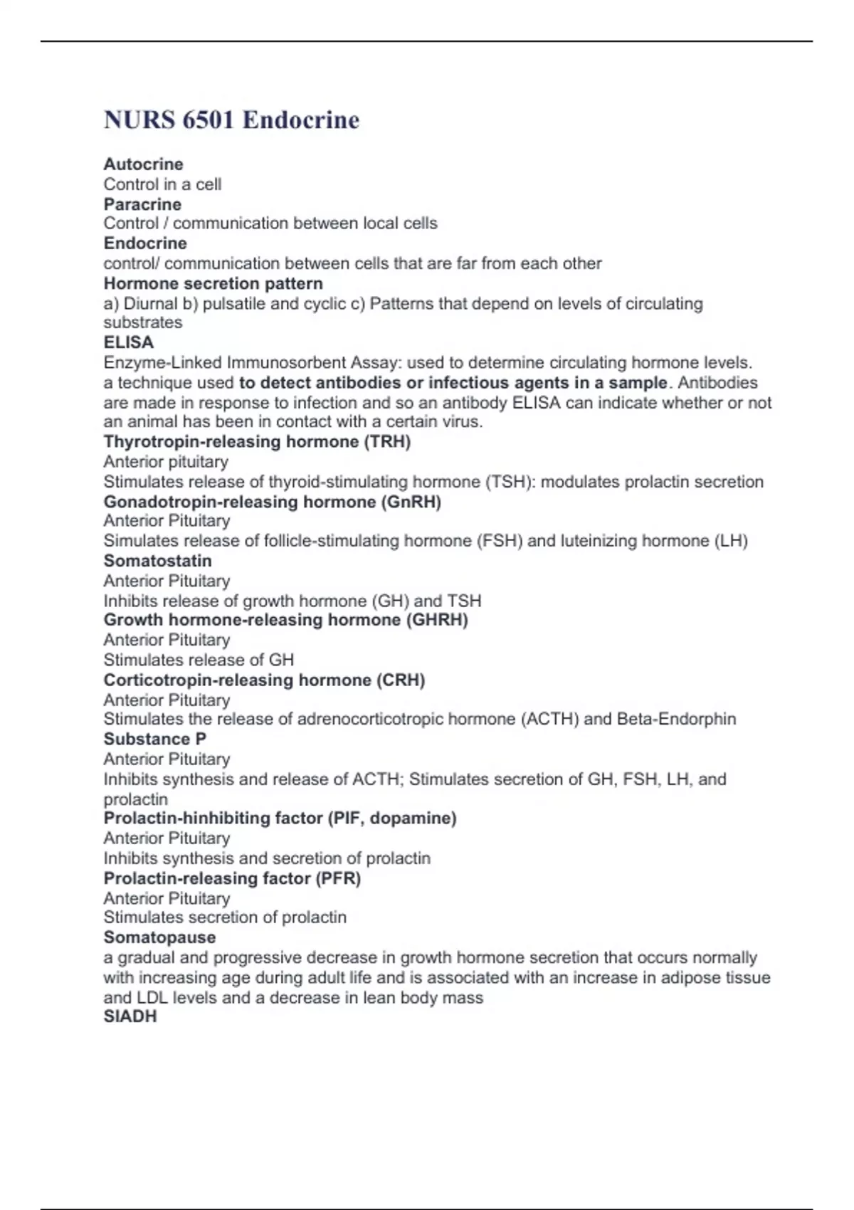 NURS 6501 Endocrine Autocrine Control in a cell Paracrine Control / communication between local cells Endocrine control/ communication between cells that are far from each other Hormone secretion pattern a) Diurnal b) pulsatile and cyclic c) Patterns that depend on levels of circulating substrates ELISA Enzyme-Linked Immunosorbent Assay: used to determine circulating hormone levels. a technique used to detect antibodies or infectious agents in a sample. Antibodies are made in response to infection and so an antibody ELISA can indicate whether or not an animal has been in contact with a certain virus. Thyrotropin-releasing hormone (TRH) Anterior pituitary Stimulates release of thyroid-stimulating hormone (TSH): modulates prolactin secretion Gonadotropin-releasing hormone (GnRH) Anterior Pituitary Simulates release of follicle-stimulating hormone (FSH) and luteinizing hormone (LH) Somatostatin Anterior Pituitary