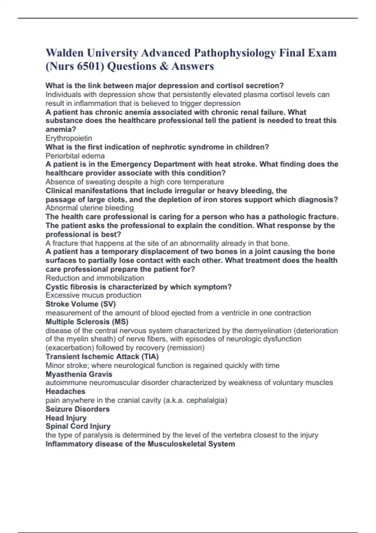 Walden University Advanced Pathophysiology Final Exam (Nurs 6501) Questions & Answers What is the link between major depression and cortisol secretion? Individuals with depression show that persistently elevated plasma cortisol levels can result in inflammation that is believed to trigger depression A patient has chronic anemia associated with chronic renal failure. What substance does the healthcare professional tell the patient is needed to treat this anemia? Erythropoietin What is the first indication of nephrotic syndrome in children? Periorbital edema A patient is in the Emergency Department with heat stroke. What finding does the healthcare provider associate with this condition? Absence of sweating despite a high core temperature Clinical manifestations that include irregular or heavy bleeding, the passage of large clots, and the depletion of iron stores support which diagnosis? Abnormal uterine bleeding The health care professional is caring for a person who has a pathologic fracture. The patient asks the professional to explain the condition. What response by the professional is best? A fracture that happens at the site of an abnormality already in that bone. A patient has a temporary displacement of two bones in a joint causing the bone surfaces to partially lose contact with each other. What treatment does the health care professional prepare the patient for? Reduction and immobilization Cystic fibrosis is characterized by which symptom? Excessive mucus production Stroke Volume (SV)