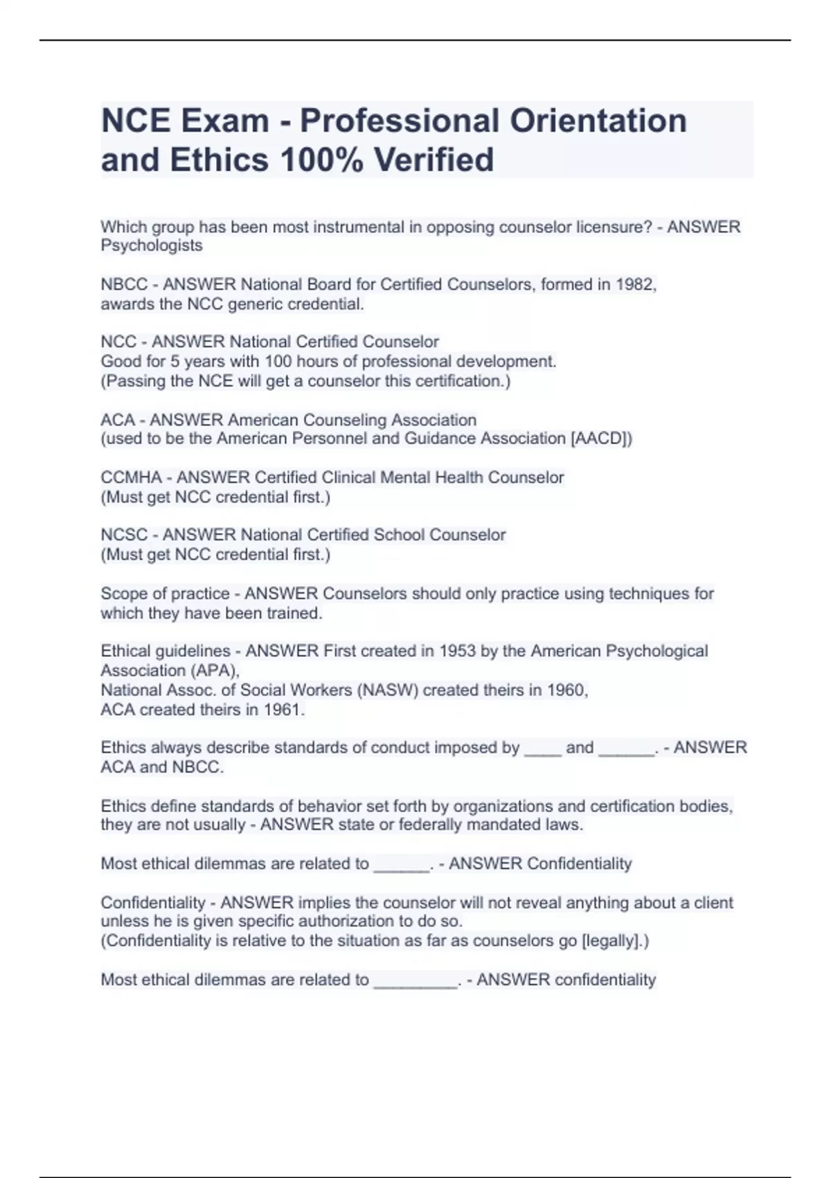 Which group has been most instrumental in opposing counselor licensure? - ANSWER Psychologists NBCC - ANSWER National Board for Certified Counselors, formed in 1982, awards the NCC generic credential. NCC - ANSWER National Certified Counselor Good for 5 years with 100 hours of professional development. (Passing the NCE will get a counselor this certification.) ACA - ANSWER American Counseling Association (used to be the American Personnel and Guidance Association [AACD]) CCMHA - ANSWER Certified Clinical Mental Health Counselor (Must get NCC credential first.) NCSC - ANSWER National Certified School Counselor (Must get NCC credential first.) Scope of practice - ANSWER Counselors should only practice using techniques for which they have been trained. Ethical guidelines - ANSWER First created in 1953 by the American Psychological Association (APA), National Assoc. of Social Workers (NASW) created theirs in 1960, ACA created theirs in 1961. Ethics always describe standards of conduct imposed by ____ and ______. - ANSWER ACA and NBCC. Ethics define standards of behavior set forth by organizations and certification bodies, they are not usually - ANSWER state or federally mandated laws. Most ethical dilemmas are related to ______. - ANSWER Confidentiality Confidentiality - ANSWER implies the counselor will not reveal anything about a client unless he is given specific authorization to do so. (Confidentiality is relative to the situation as far as counselors go [legally].) Most ethical dilemmas are related to _________. - ANSWER confidentiality ACA indicates counselors have an obligation to protect the confidentiality of the deceased and this should be sta