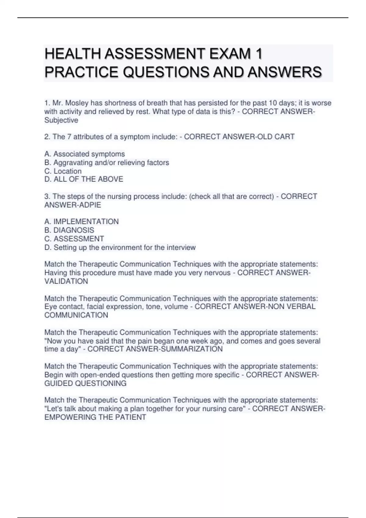 HEALTH ASSESSMENT EXAM 1 PRACTICE QUESTIONS AND ANSWERS 1. Mr. Mosley has shortness of breath that has persisted for the past 10 days; it is worse with activity and relieved by rest. What type of data is this? - CORRECT ANSWERSubjective 2. The 7 attributes of a symptom include: - CORRECT ANSWER-OLD CART A. Associated symptoms B. Aggravating and/or relieving factors C. Location D. ALL OF THE ABOVE 3. The steps of the nursing process include: (check all that are correct) - CORRECT ANSWER-ADPIE A. IMPLEMENTATION B. DIAGNOSIS C. ASSESSMENT D. Setting up the environment for the interview Match the Therapeutic Communication Techniques with the appropriate statements: Having this procedure must have made you very nervous - CORRECT ANSWERVALIDATION Match the Therapeutic Communication Techniques with the appropriate statements: Eye contact, facial expression, tone, volume - CORRECT ANSWER-NON VERBAL COMMUNICATION Match the Therapeutic Communication Techniques with the appropriate statements: "Now you have said that the pain began one week ago, and comes and goes several time a day" - CORRECT ANSWER-SUMMARIZATION Match the Therapeutic Communication Techniques with the appropriate statements: Begin with open-ended questions then getting more specific - CORRECT ANSWERGUIDED QUESTIONING Match the Therapeutic Communication Techniques with the appropriate statements: "Let's talk about making a plan together for your nursing care" - CORRECT ANSWEREMPOWERING THE PATIENT Match the Therapeutic Communication Techniques with the appropriate statements: "I understand how you might be upset about this" - CORRECT ANSWER-EMPATHETIC RESPONSES Match the Therapeutic Communication Techniques with the appropriate statements: "You did the right thing by coming to get care today. I will let you know what each test means" - CORRECT ANSWER-REASSURNCE Match the Therapeutic Communication Techniques with the appropriate statements:Paying close attention to what the patient is saying - CORRECT ANSWERACTIVE LISTENING Match the Therapeutic Communication Techniques with the appropriate statements: I. "I think we have all the information about your current symptoms. Now I will ask you some questions about your past health history" - CORRECT ANSWER-TRANSITIONS 5. Which of the following are subjective data? (choose all the apply) A. "I have a stomachache with diarrhea." B. The lunch sounds are clear throughout all areas upon auscultation. C. "Mother has had diabetes for 20 years." D. The skin is warm and dry to touch. - CORRECT ANSWER-A AND C 6. Place the problem listen in order of priority, most serious and urgent to least serious. A. Chest pain B. Smoking C. Low back pain for several months D. Bruised knee - CORRECT ANSWER-A, B, C, D 7. Which of the following questions are leading questions? A. "You don't have any chest pain do you?" B. "Which of the following describes your pain: aching, sharp, or throbbing?" C. "Is your headache pain like a throbbing pain?" D. "How many stairs can you walk up before you become short of breath?" - CORRECT ANSWER-A AND C 8. The question "how many blocks can you walk before the leg pain occurs?" is asking for a graded response. (T OR F) - CORRECT ANSWER-TRUE 9. Which of the following are examples of primary prevention? (Choose all that apply) A. Immunizations B. Self-examination of skin lesions C. Health education D. Seat belts - CORRECT ANSWER-ANSWER = A, C, D - PREVENTING DISEASE ALL TOGETHER